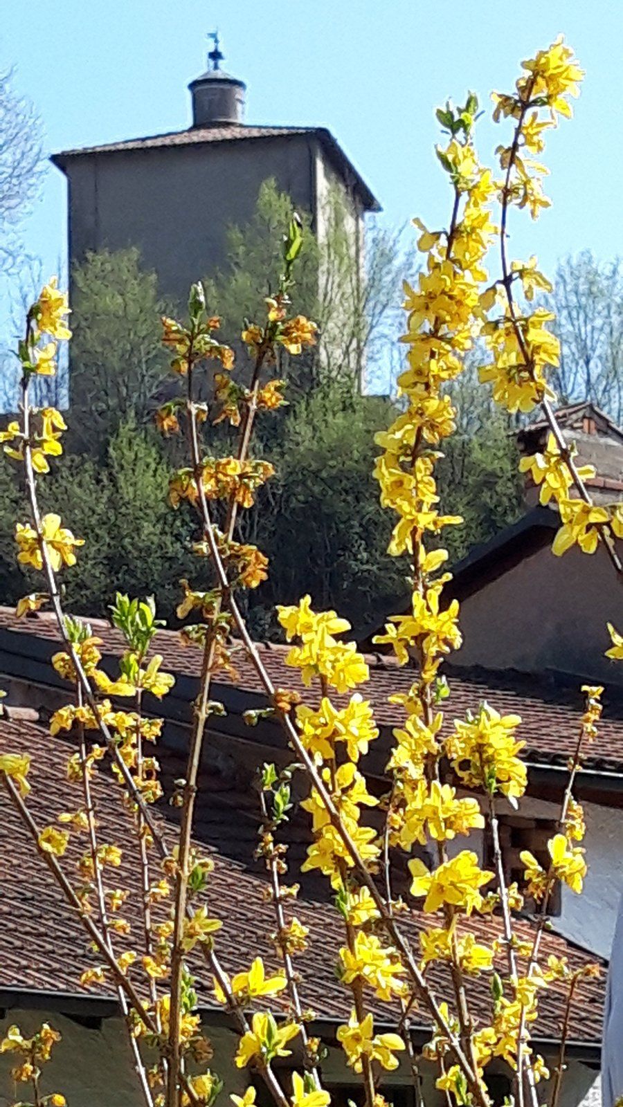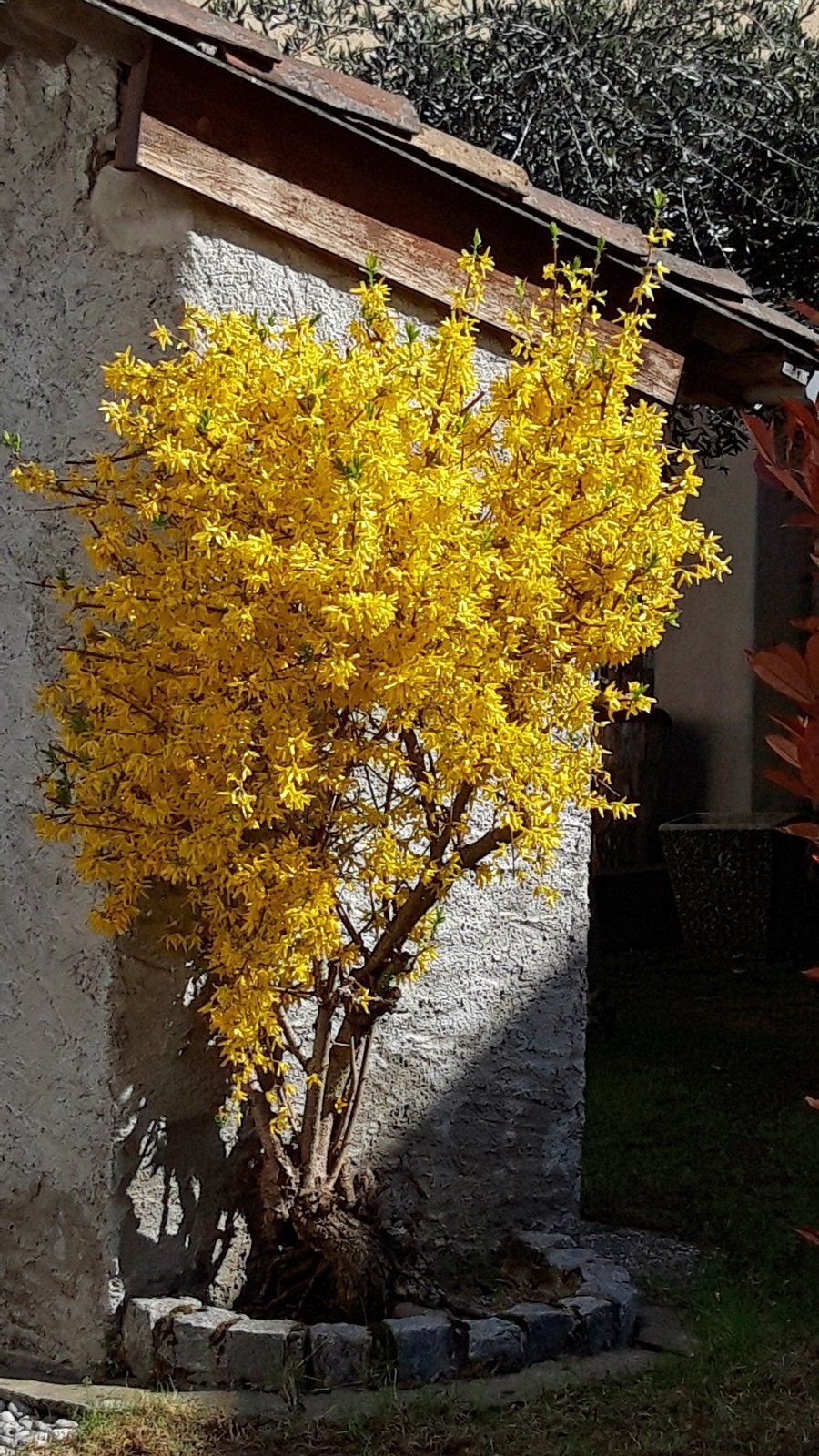 Beliebter Zierstrauch in Parks und Gärten. Forsythien gehören zur Familie der Ölbaungewächse, sind also unter anderem mit dem Olivenbaum verwandt.