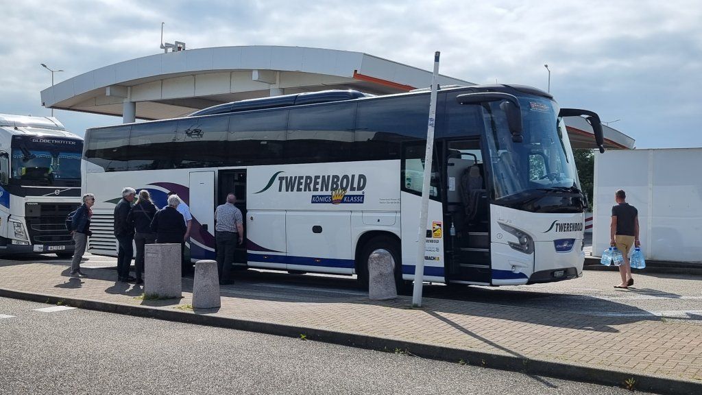 Bequeme Sitze, viel Platz, aber keine Reiseleitung, keine Musikanlage, keine Abfallablagen, nur 1 Fahrer mit 29 Gästen, WLAN vorhanden, aber keine Steckdosen für die Handys. Zum Glück habe ich mein Ladegerät dabei. Eine Corona Plexiglasscheibe hinter dem Busfahrer verhindert das Fotografieren während der Fahrt.