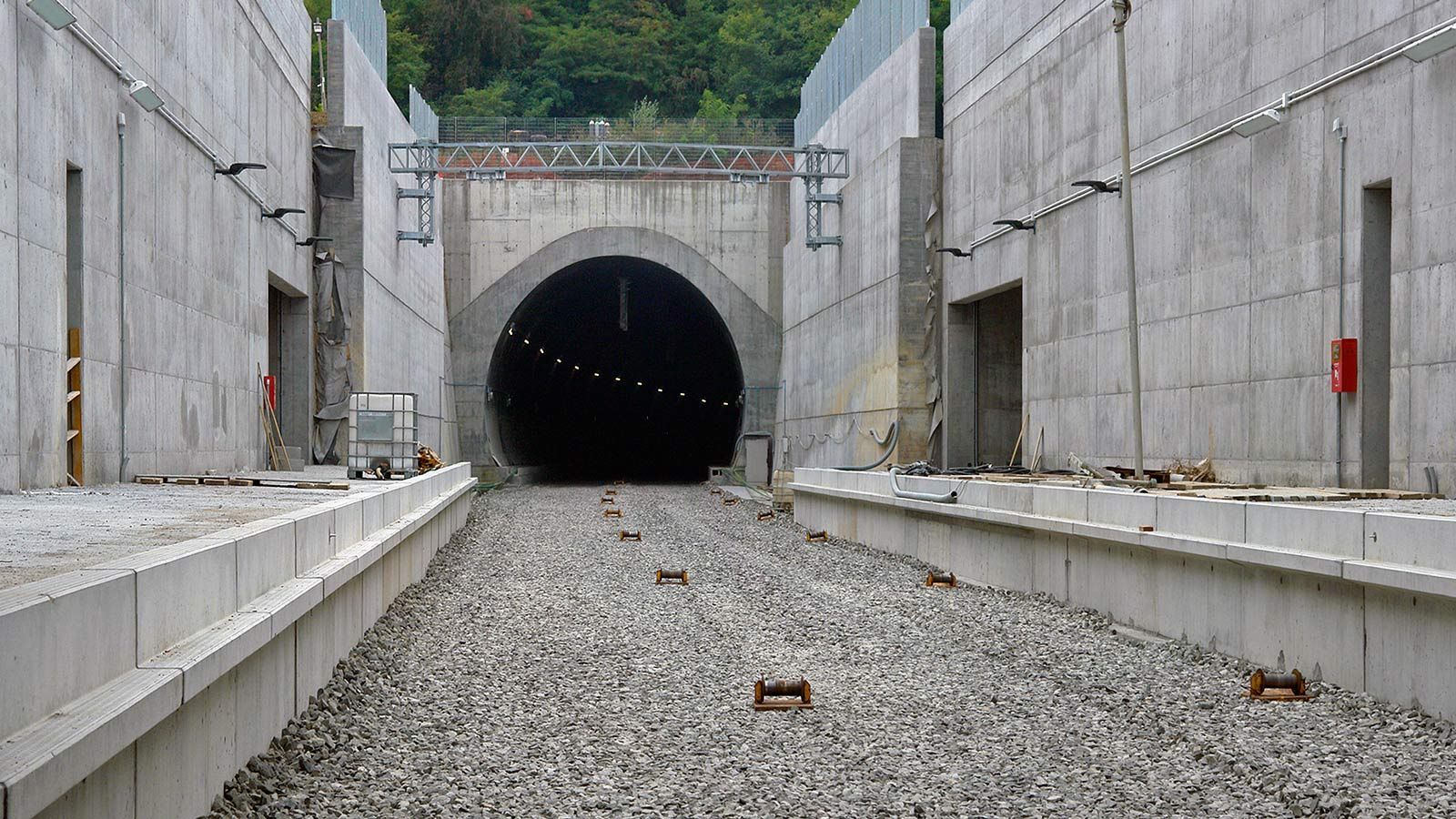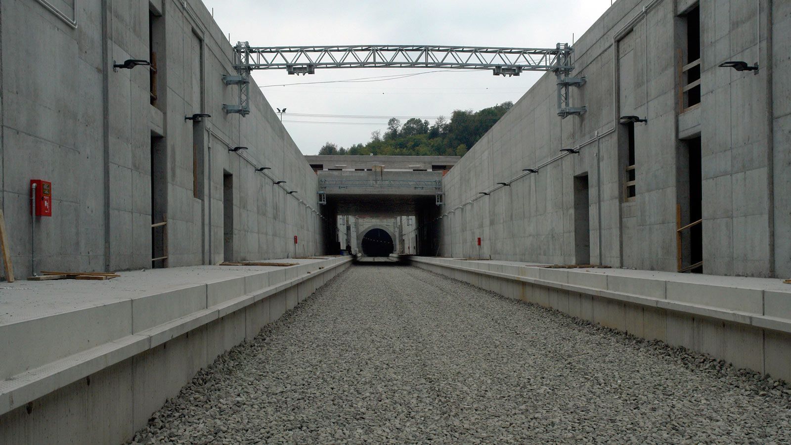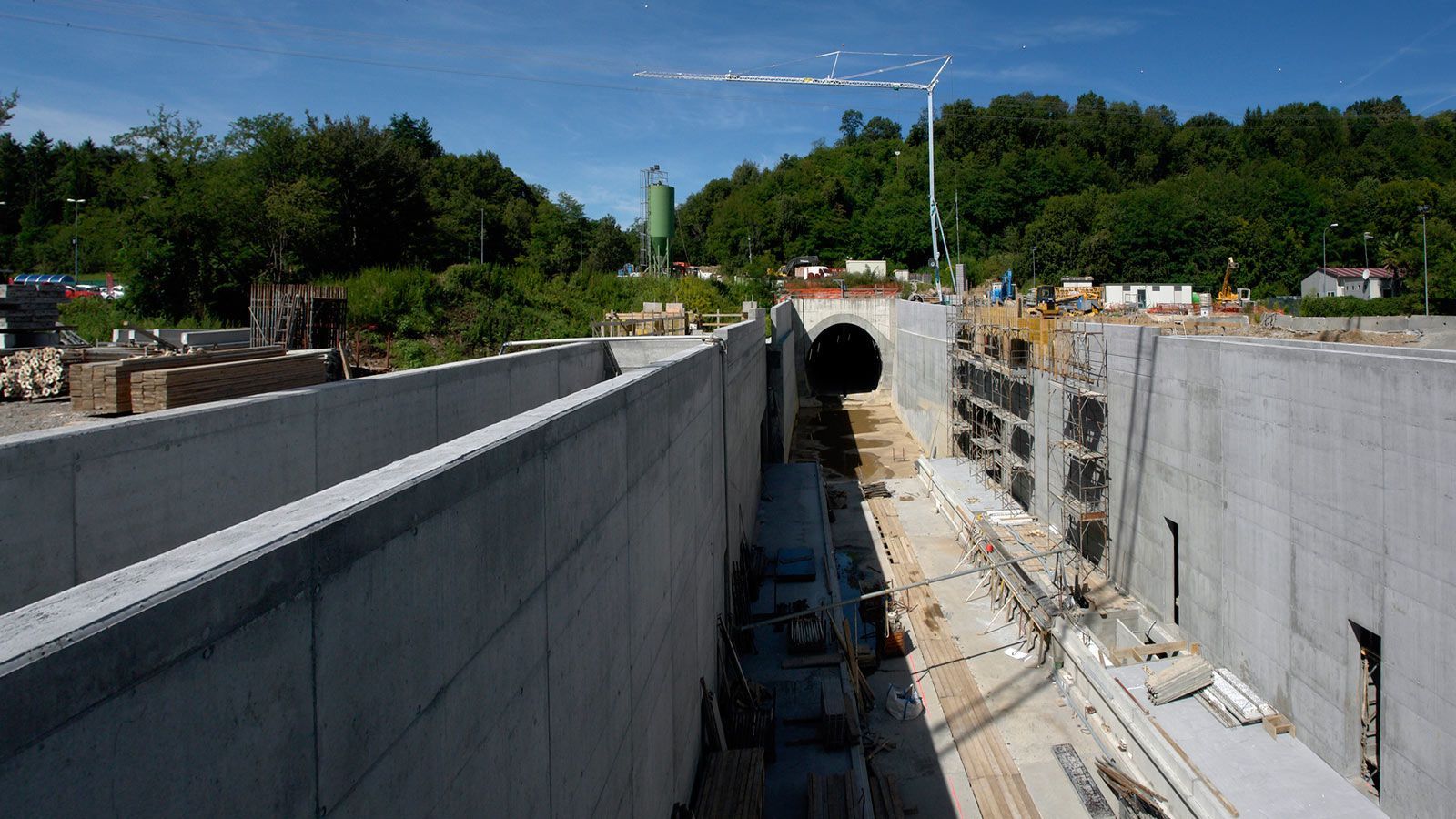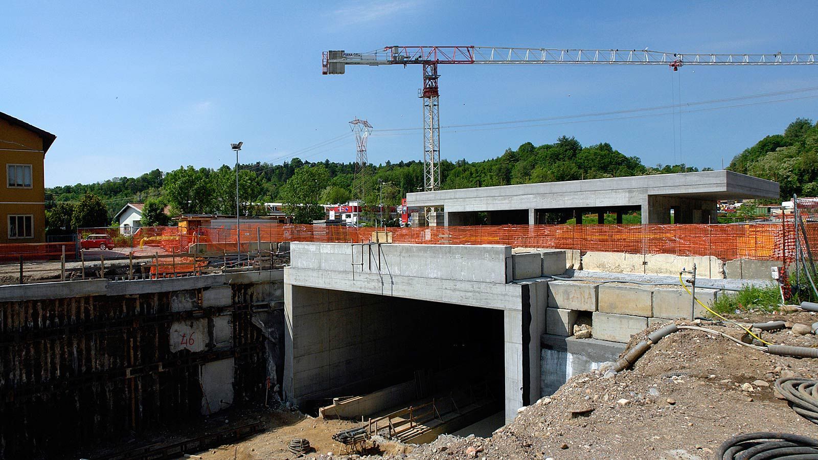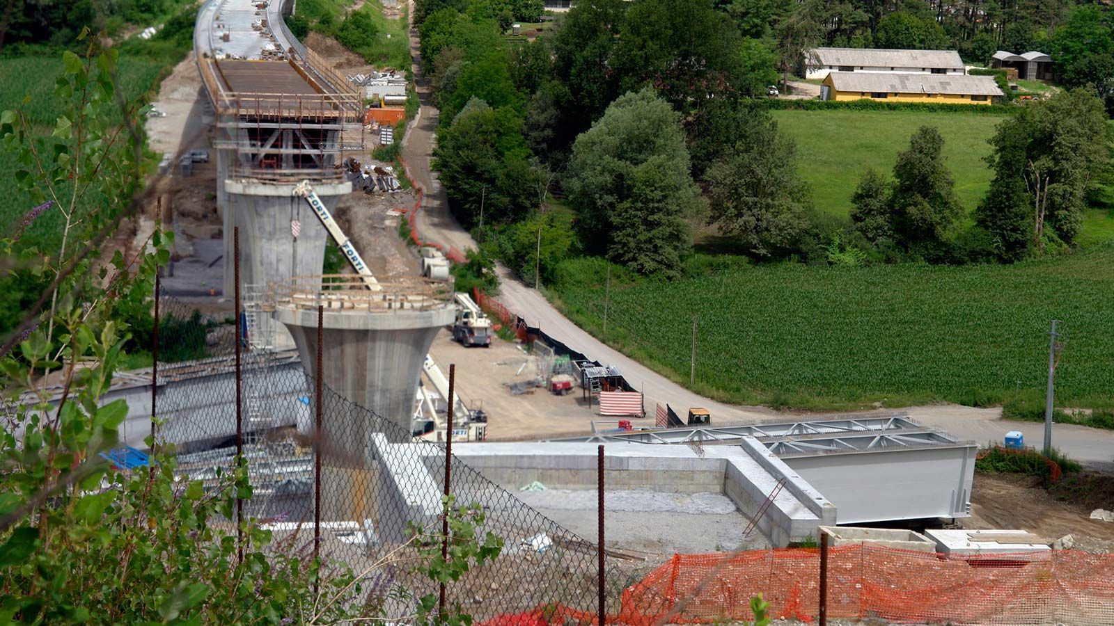 Die Strecke von der Landesgrenze bis zum Tunnel ist für den Geleisebau vorbereitet. Sämtliche Betonbauten sind fertiggestellt. An der Grenze steht nur noch ein 20m breiter Grünstreifen. Die Perrons im unterirdischen Bahnhof Gaggiolo sind im Rohbau fertig. Der neue, diesmal blaue, Kran ist aufgestellt und bereit die beiden letzten Bahnbrückenteile hoch zu heben.