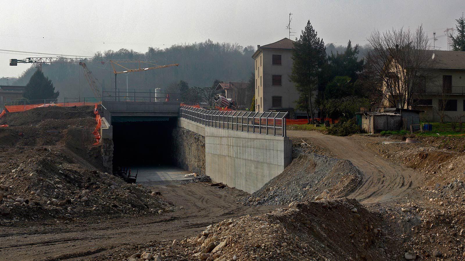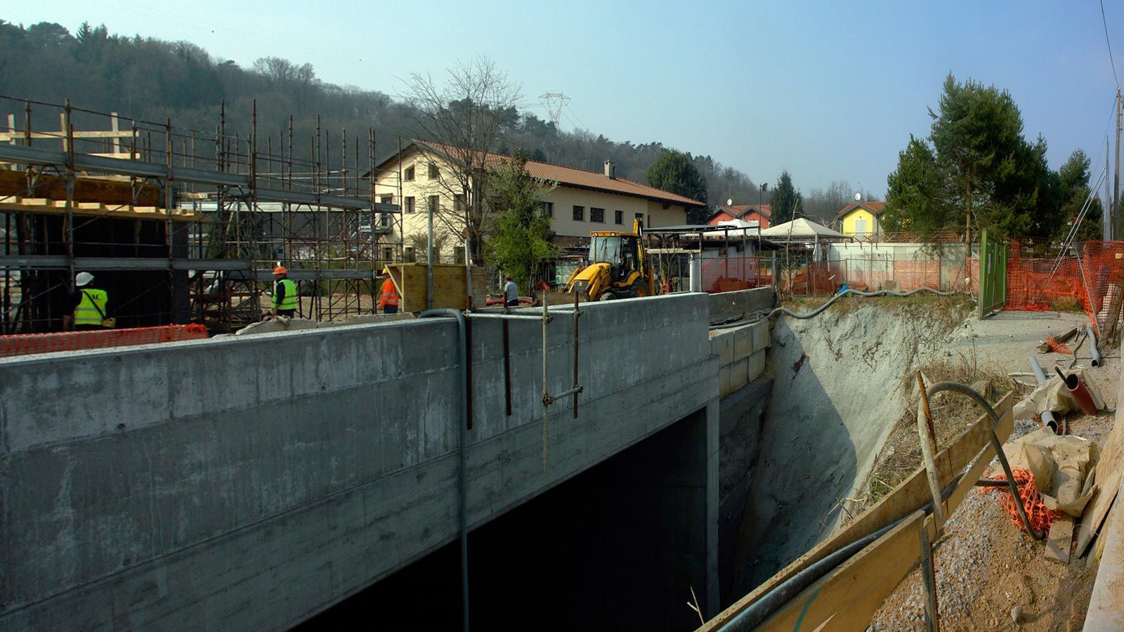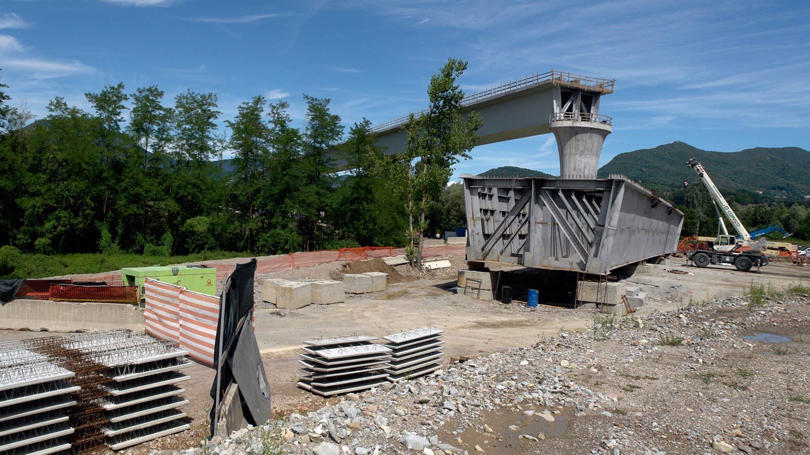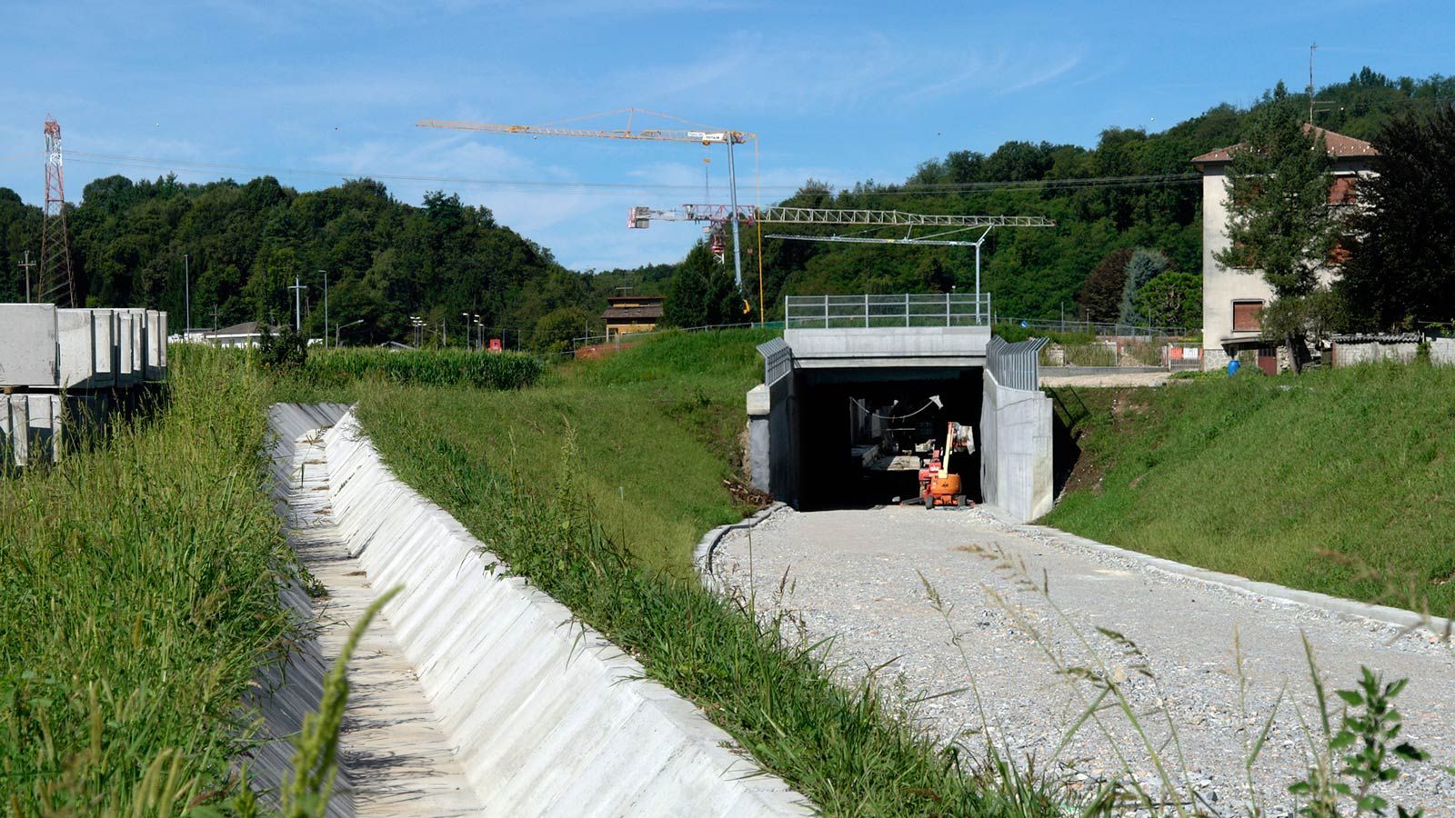 Die Strecke von der Landesgrenze bis zum Tunnel ist für den Geleisebau vorbereitet. Sämtliche Betonbauten sind fertiggestellt. An der Grenze steht nur noch ein 20m breiter Grünstreifen. Die Perrons im unterirdischen Bahnhof Gaggiolo sind im Rohbau fertig. Der neue, diesmal blaue, Kran ist aufgestellt und bereit die beiden letzten Bahnbrückenteile hoch zu heben.
