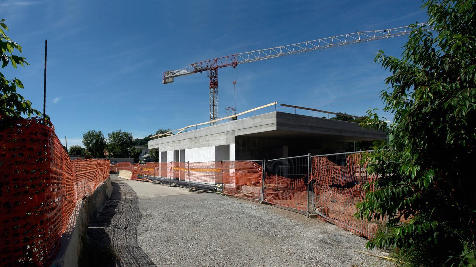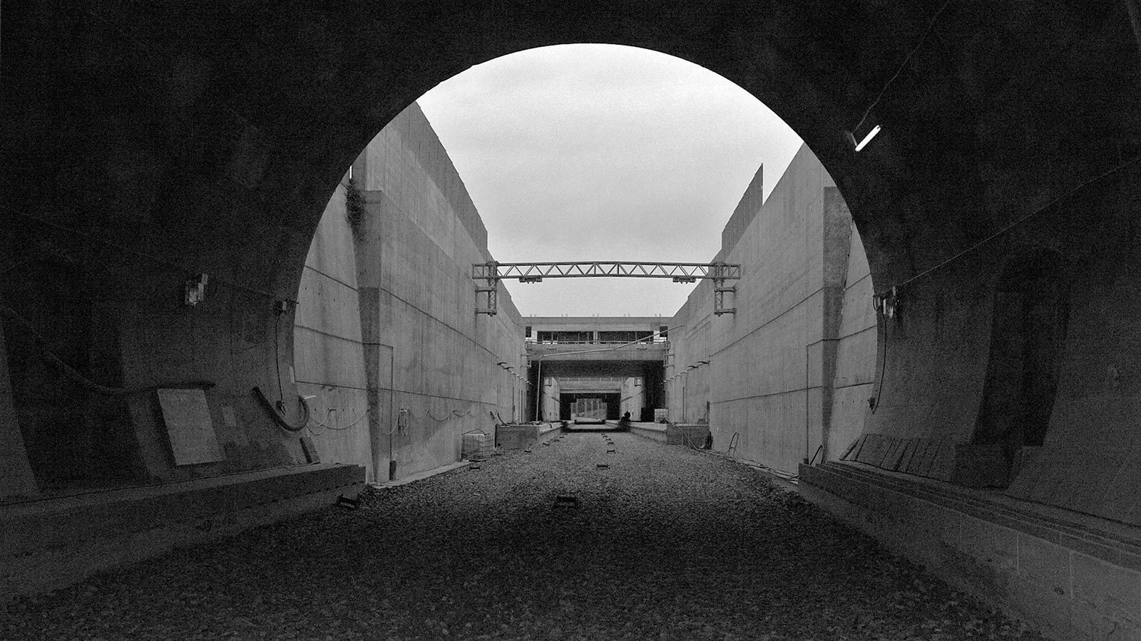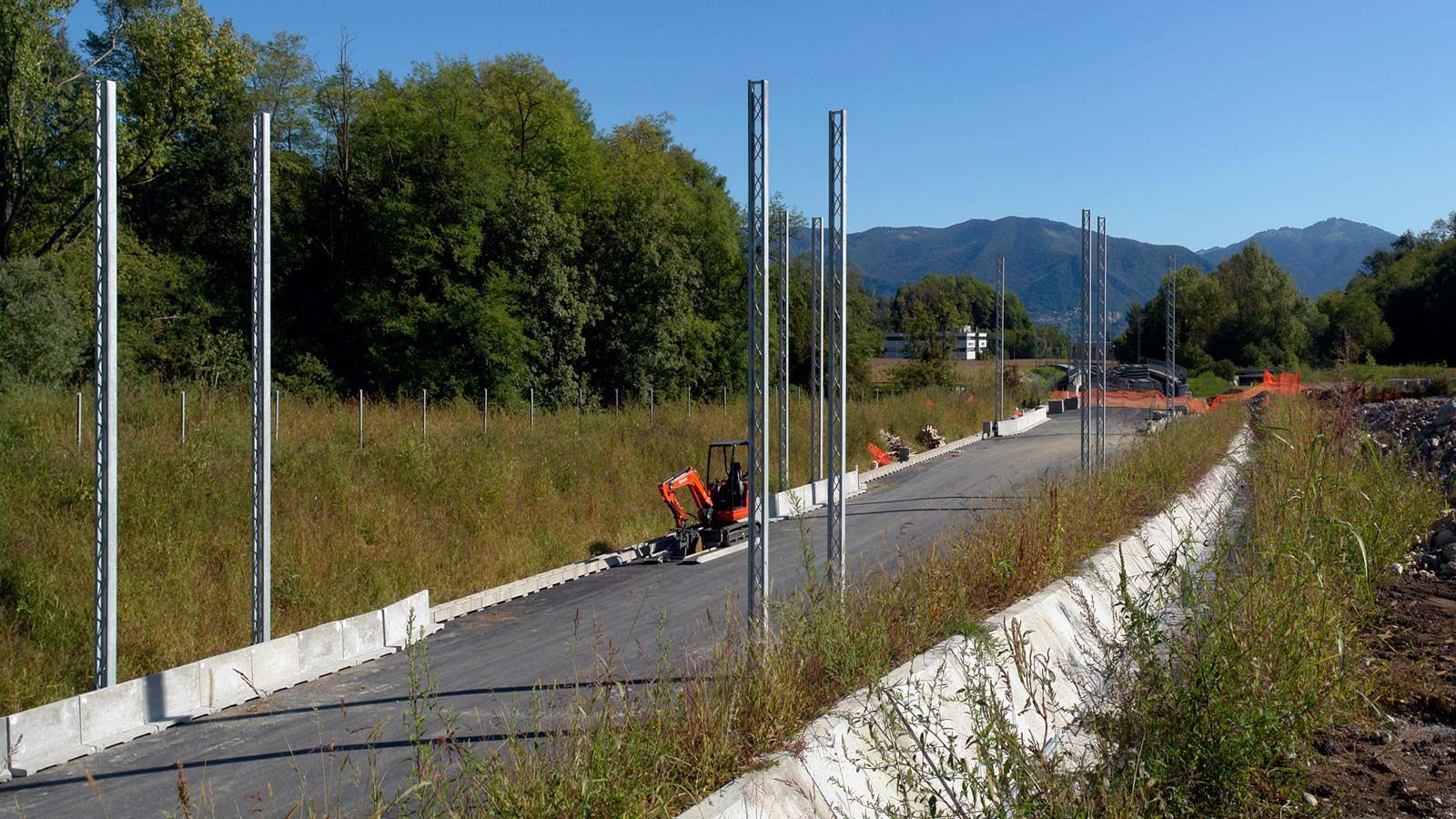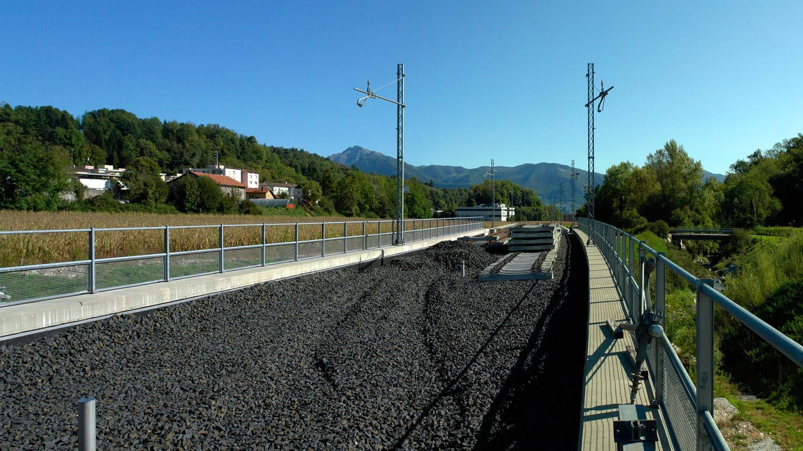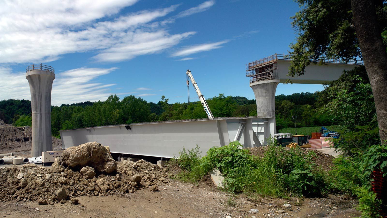 Die Strecke von der Landesgrenze bis zum Tunnel ist für den Geleisebau vorbereitet. Sämtliche Betonbauten sind fertiggestellt. An der Grenze steht nur noch ein 20m breiter Grünstreifen. Die Perrons im unterirdischen Bahnhof Gaggiolo sind im Rohbau fertig. Der neue, diesmal blaue, Kran ist aufgestellt und bereit die beiden letzten Bahnbrückenteile hoch zu heben.