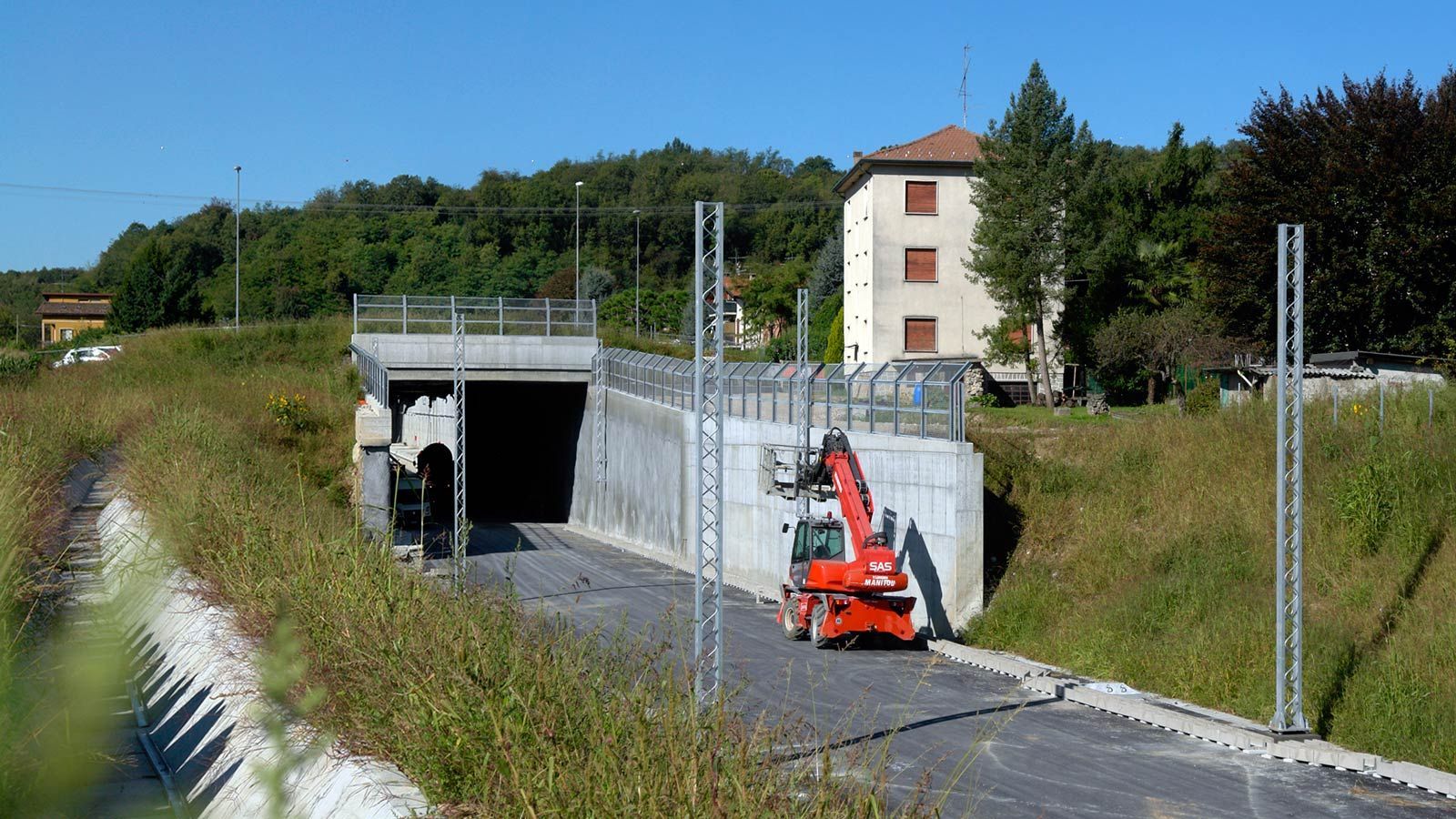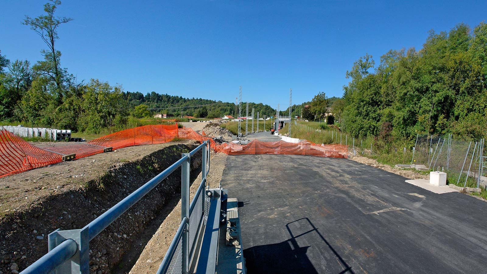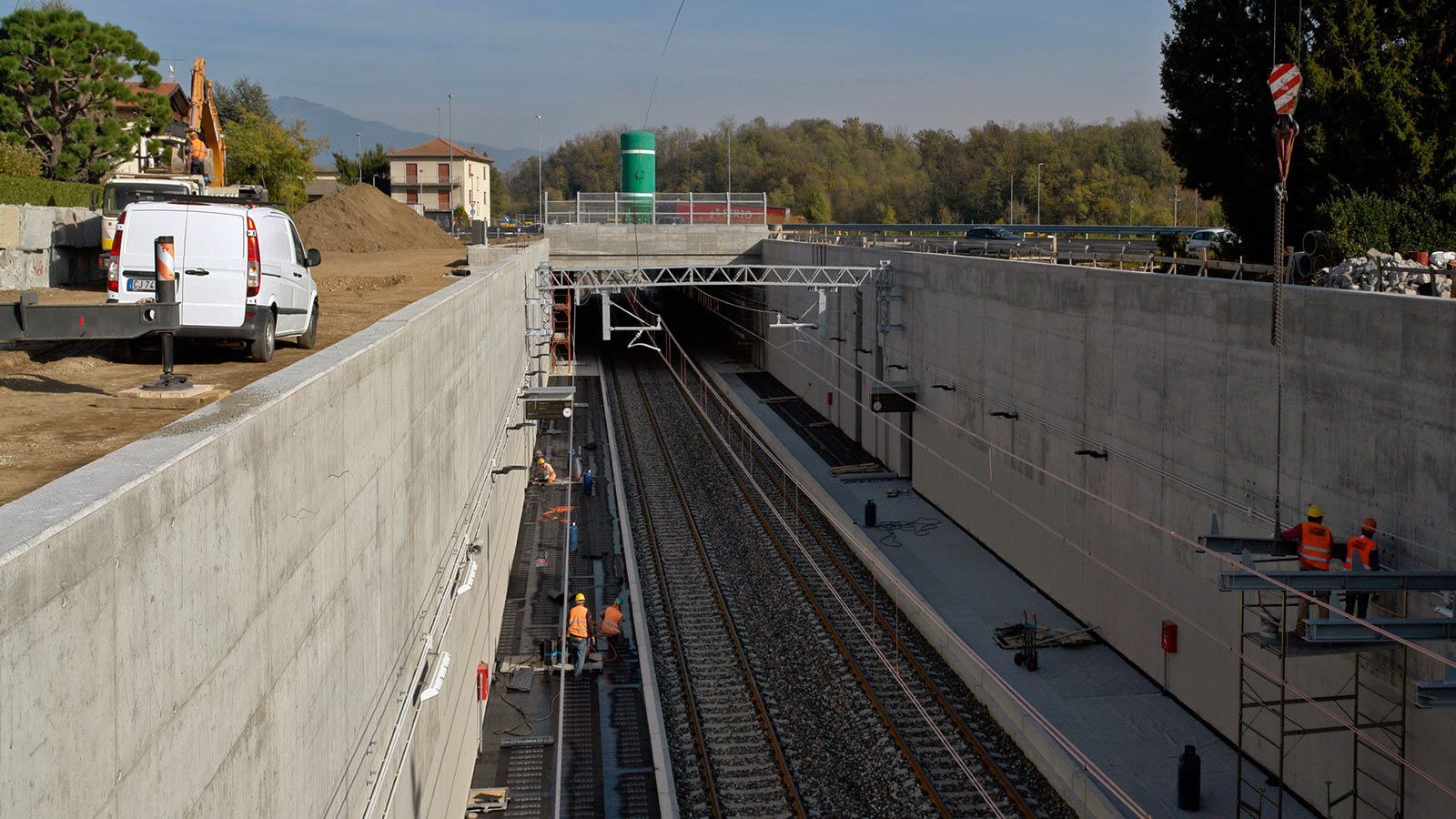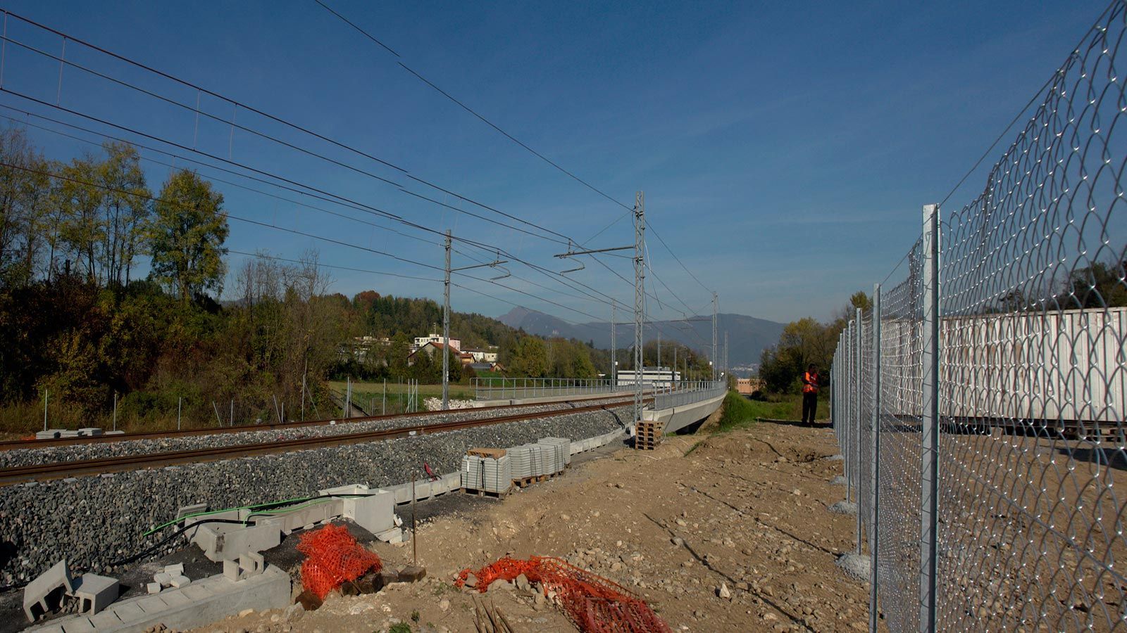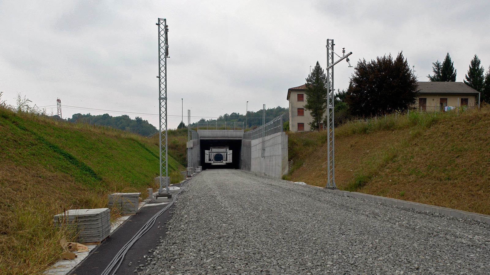 Die Strecke von der Landesgrenze bis zum Tunnel ist für den Geleisebau vorbereitet. Sämtliche Betonbauten sind fertiggestellt. An der Grenze steht nur noch ein 20m breiter Grünstreifen. Die Perrons im unterirdischen Bahnhof Gaggiolo sind im Rohbau fertig. Der neue, diesmal blaue, Kran ist aufgestellt und bereit die beiden letzten Bahnbrückenteile hoch zu heben.