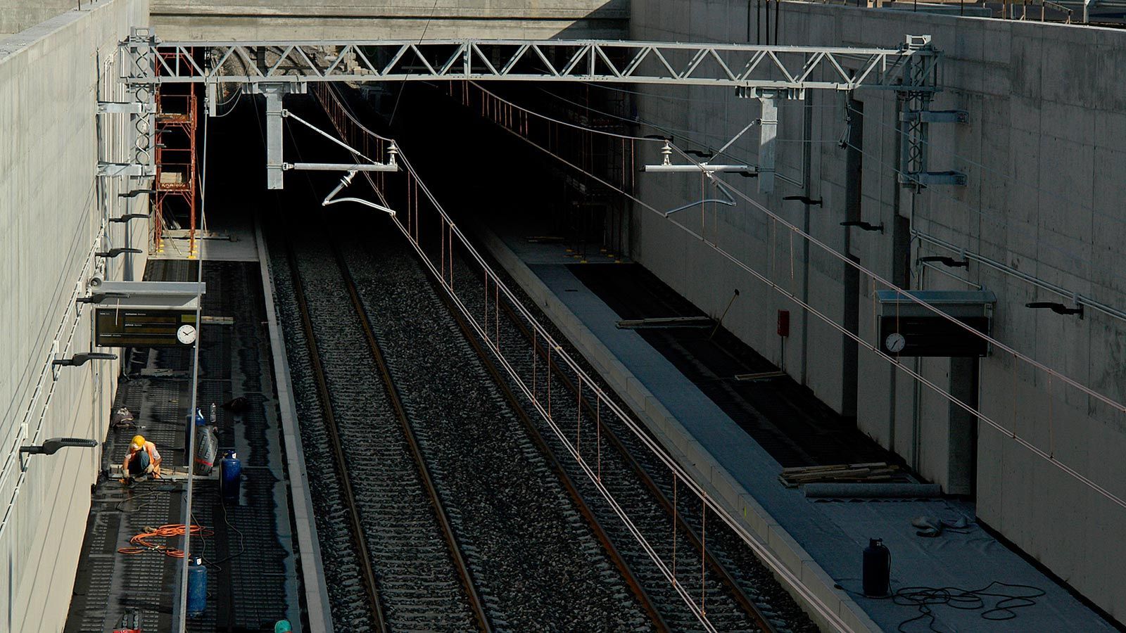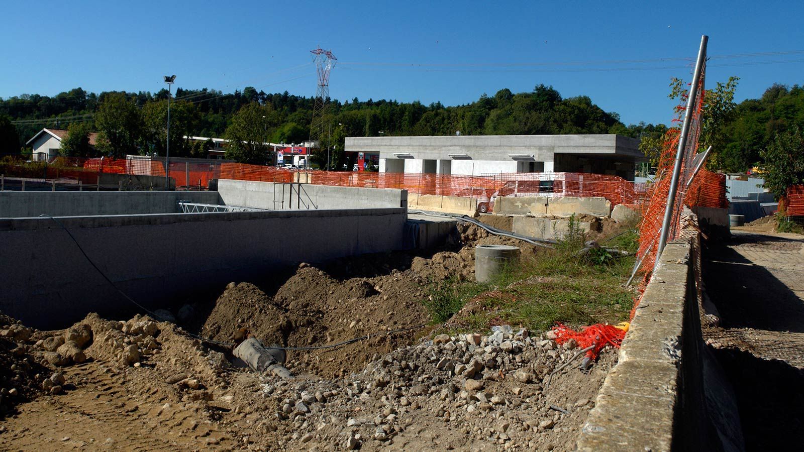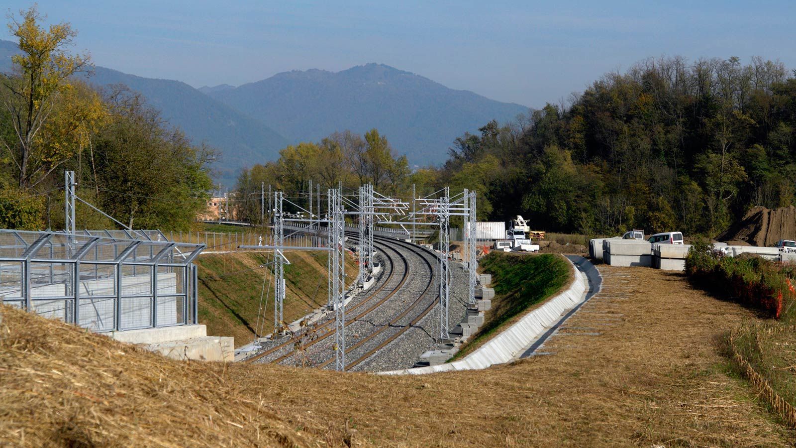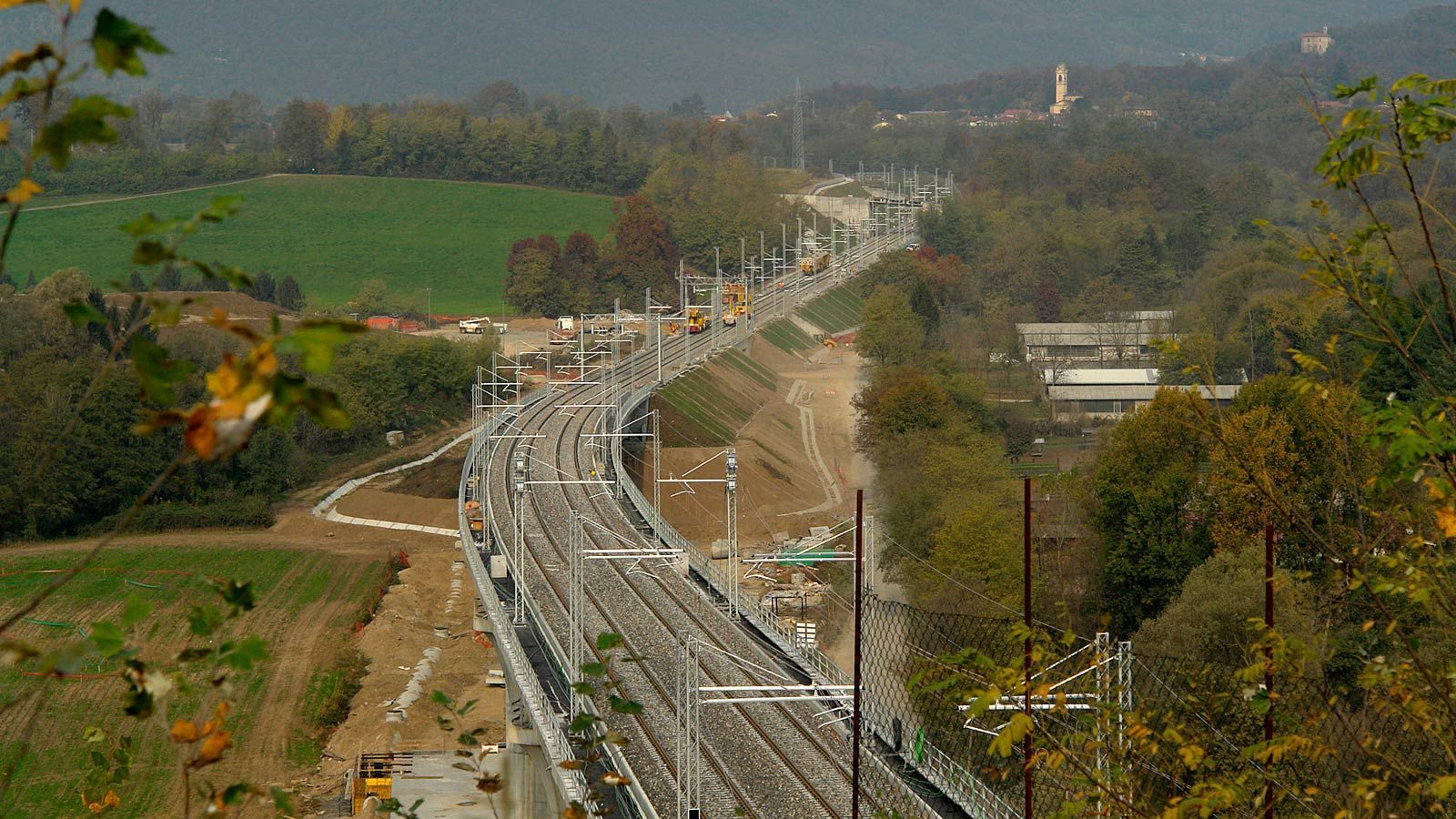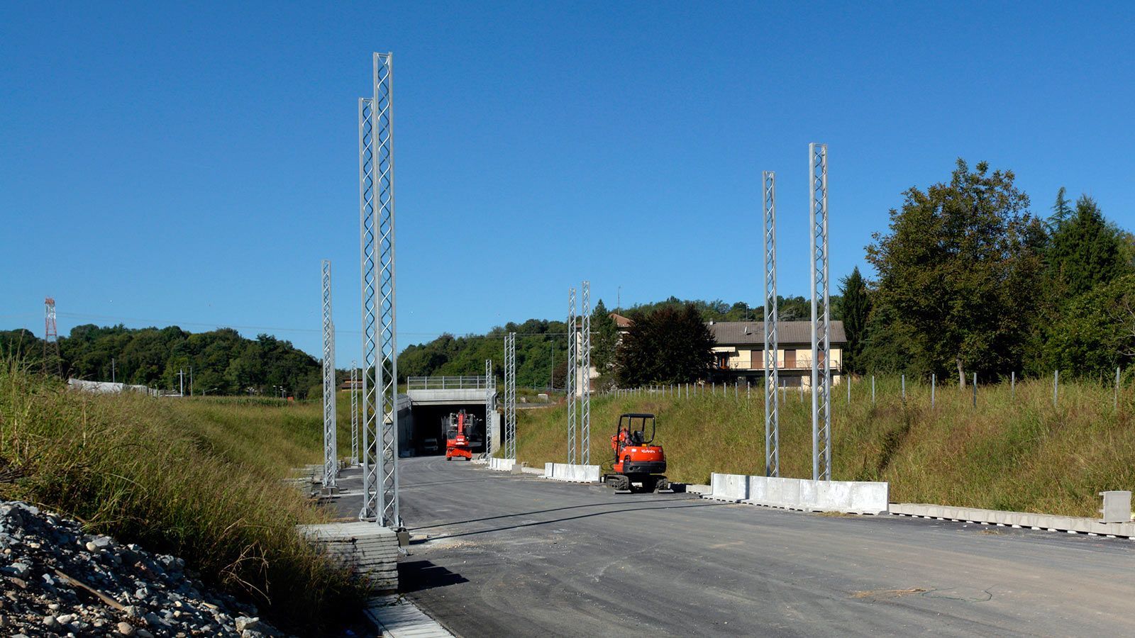 Die Strecke von der Landesgrenze bis zum Tunnel ist für den Geleisebau vorbereitet. Sämtliche Betonbauten sind fertiggestellt. An der Grenze steht nur noch ein 20m breiter Grünstreifen. Die Perrons im unterirdischen Bahnhof Gaggiolo sind im Rohbau fertig. Der neue, diesmal blaue, Kran ist aufgestellt und bereit die beiden letzten Bahnbrückenteile hoch zu heben.