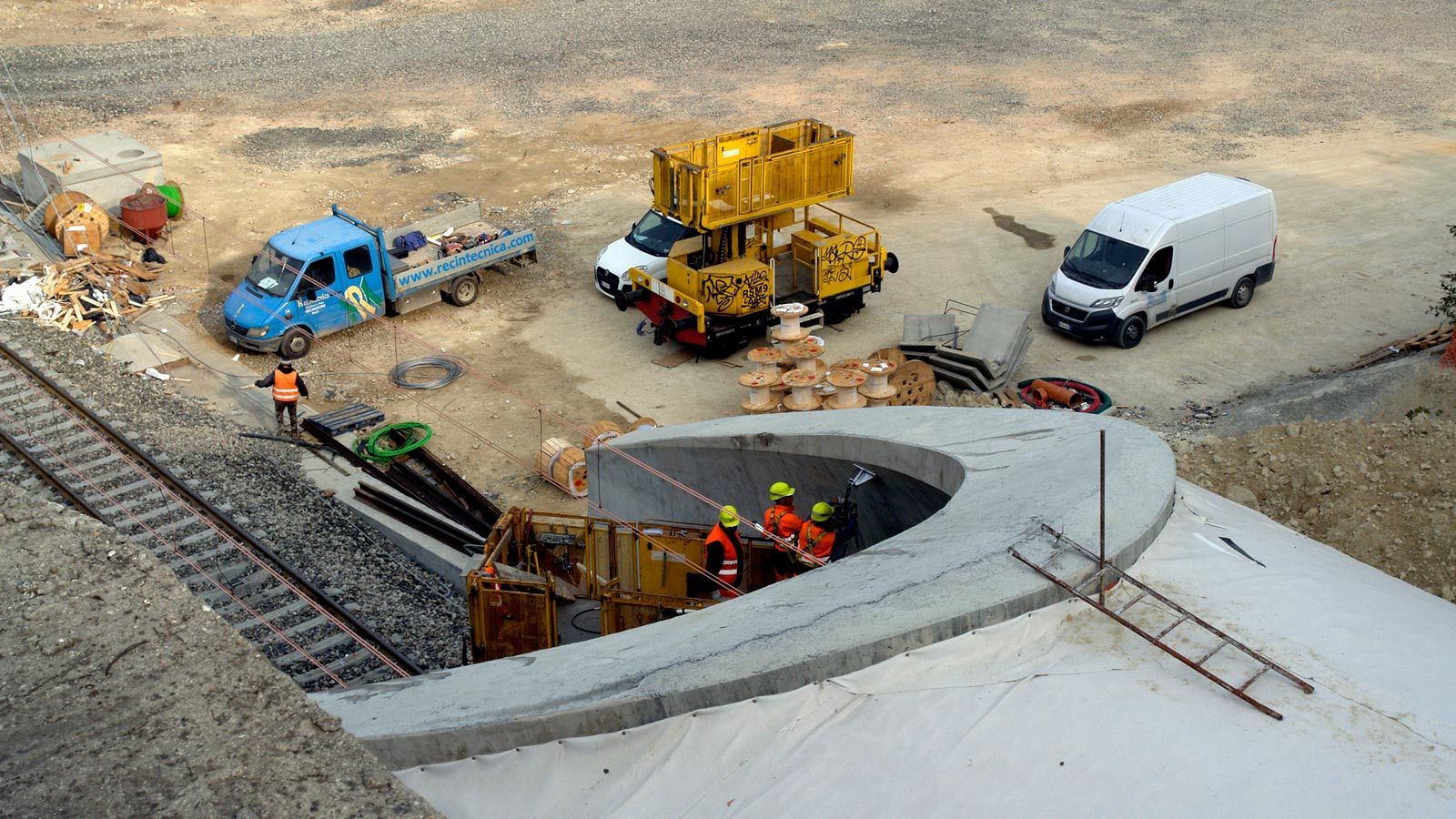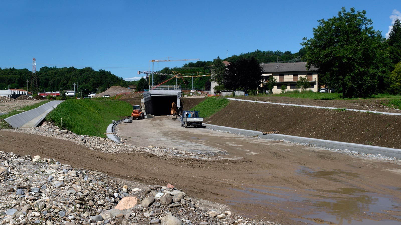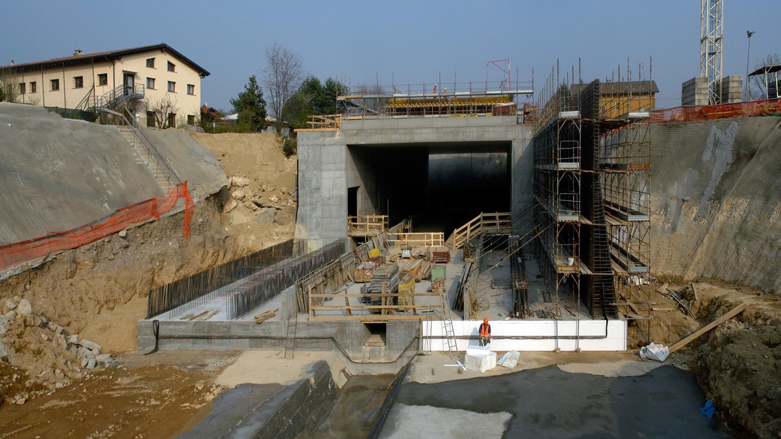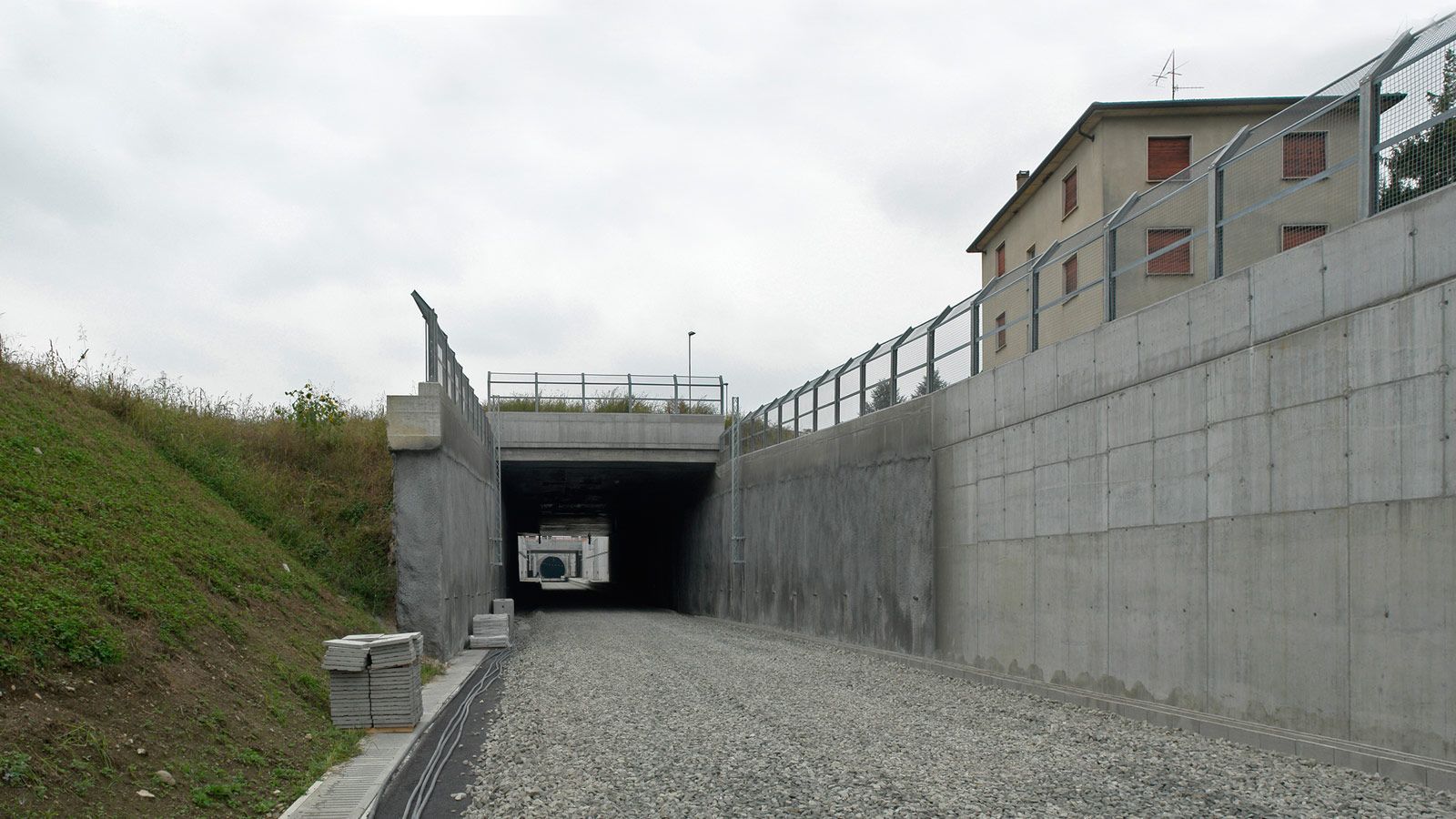 Die Strecke von der Landesgrenze bis zum Tunnel ist für den Geleisebau vorbereitet. Sämtliche Betonbauten sind fertiggestellt. An der Grenze steht nur noch ein 20m breiter Grünstreifen. Die Perrons im unterirdischen Bahnhof Gaggiolo sind im Rohbau fertig. Der neue, diesmal blaue, Kran ist aufgestellt und bereit die beiden letzten Bahnbrückenteile hoch zu heben.