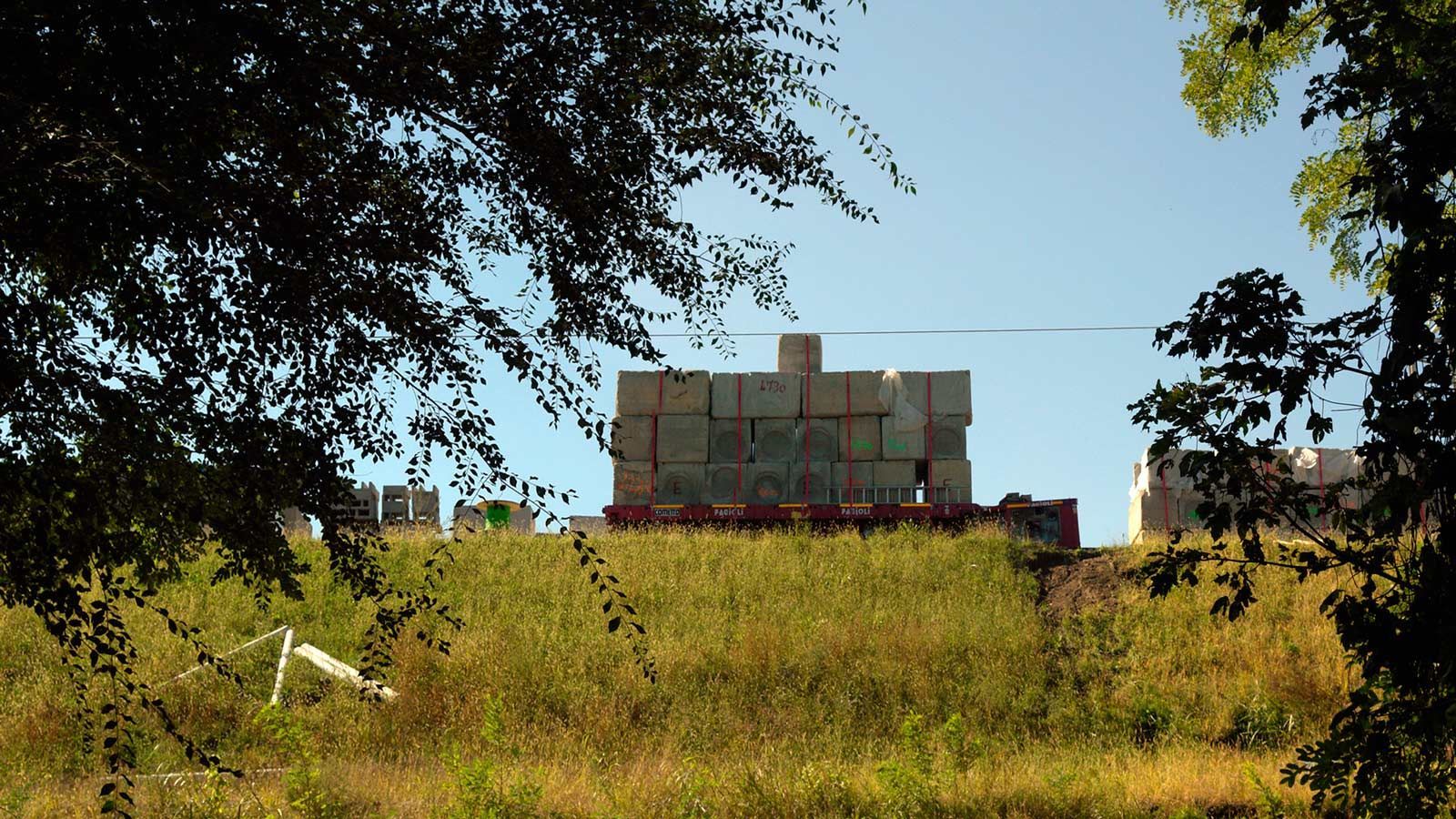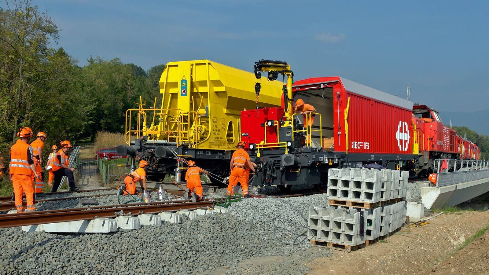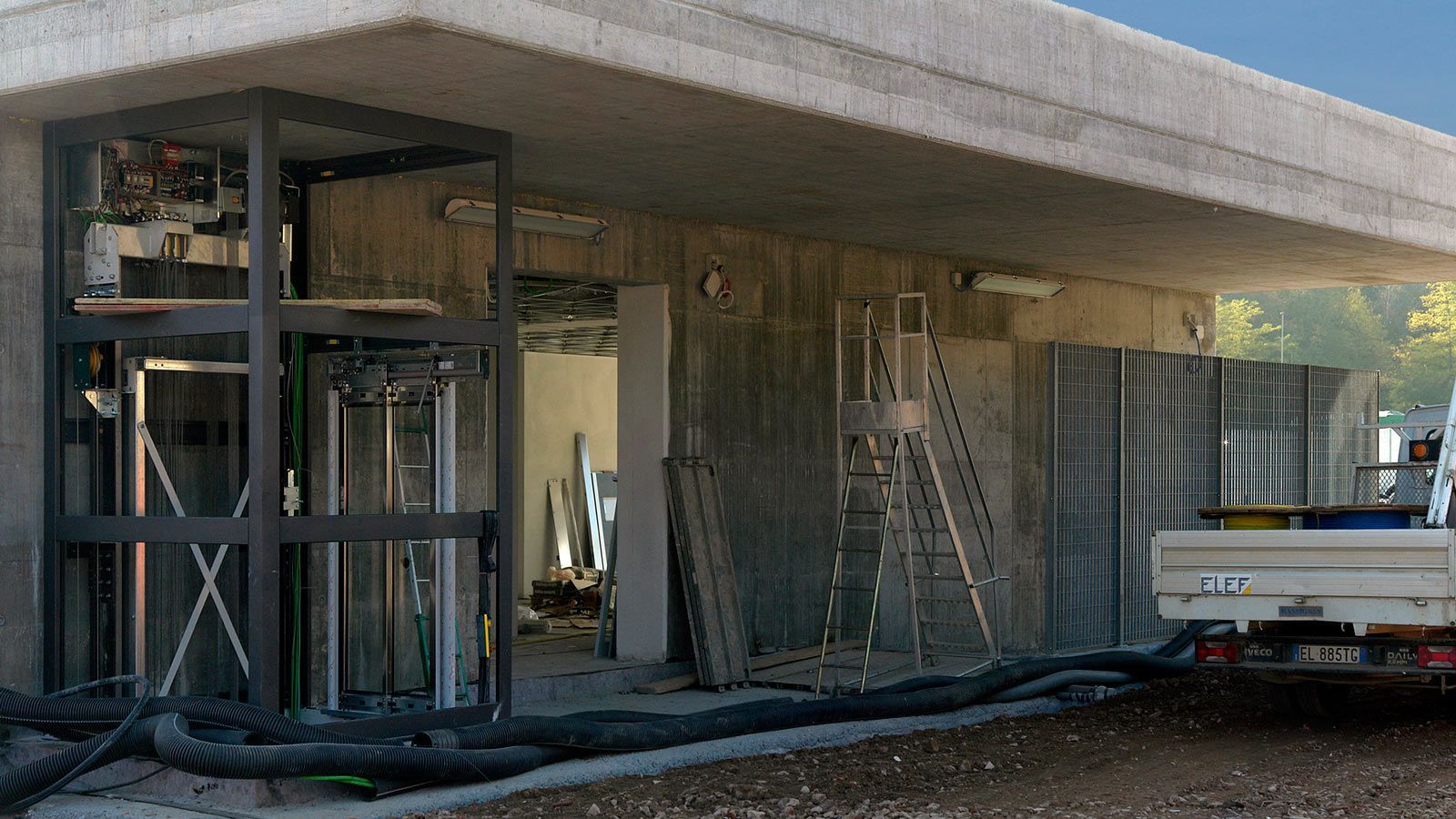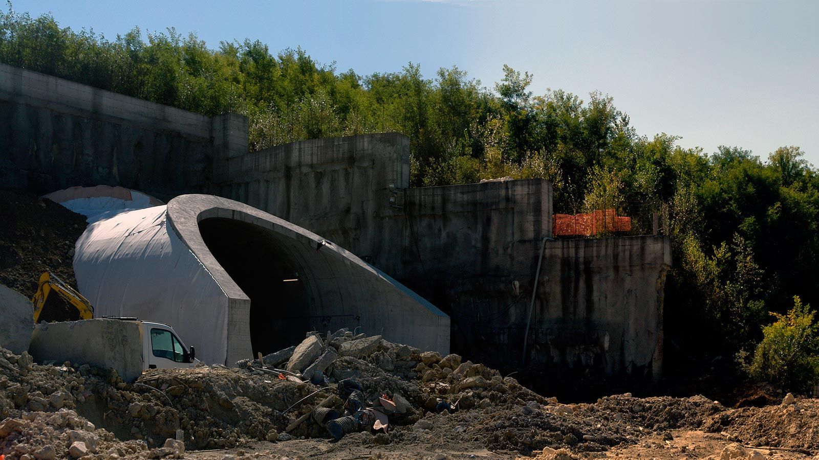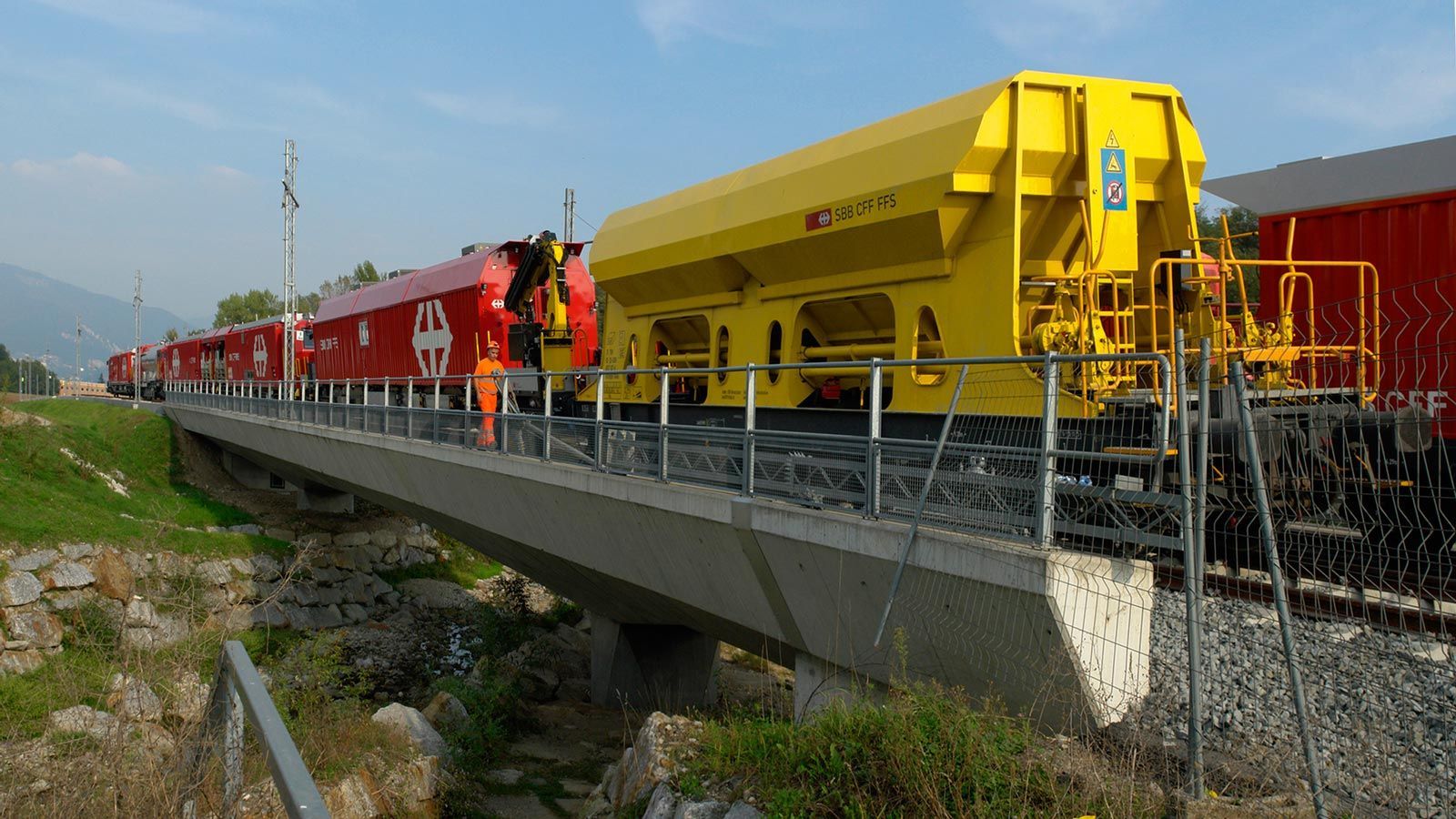 Die Strecke von der Landesgrenze bis zum Tunnel ist für den Geleisebau vorbereitet. Sämtliche Betonbauten sind fertiggestellt. An der Grenze steht nur noch ein 20m breiter Grünstreifen. Die Perrons im unterirdischen Bahnhof Gaggiolo sind im Rohbau fertig. Der neue, diesmal blaue, Kran ist aufgestellt und bereit die beiden letzten Bahnbrückenteile hoch zu heben.