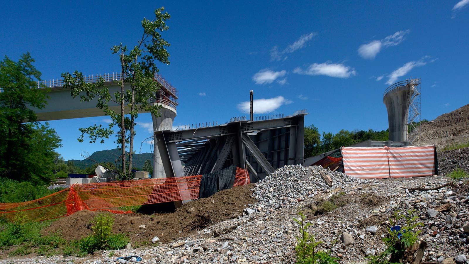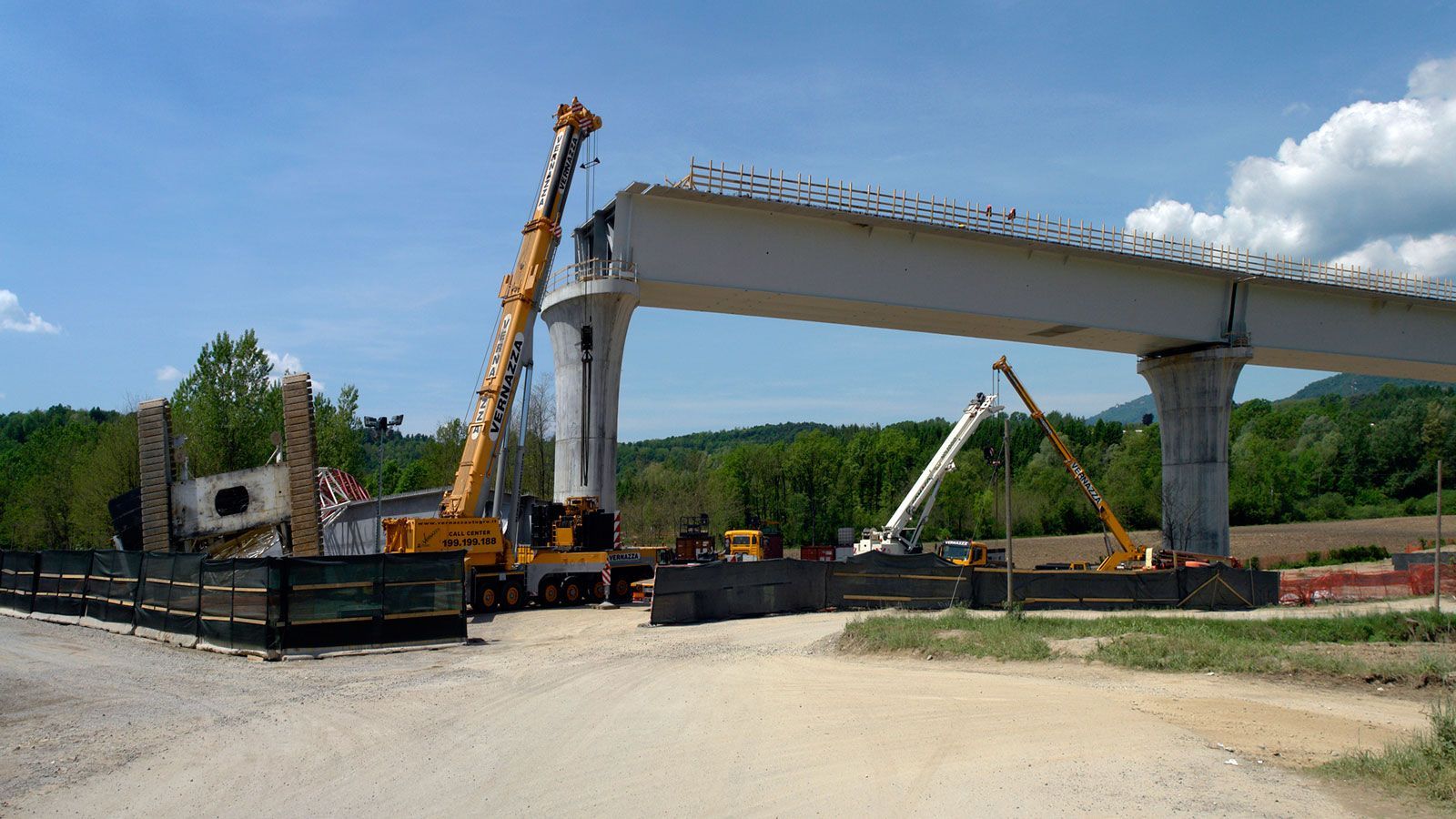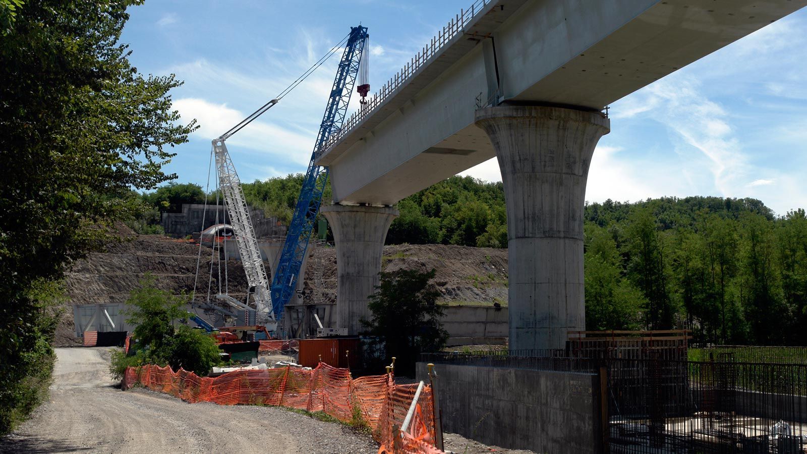 Der Blick von oberhalb der Beveratunnels auf die Bahnbrücke zeigt den Fortschritt der Bauarbeiten. Der umgefallene Kran ist weg. Zwei Brückenträger müssen noch hochgehoben werden. Der runtergefallene Brückenträger scheint wirklich nicht beschädigt zu sein und wird sicher noch diesen Monat hochgehoben. Ein fabrikneuer Kran ist geliefert, muss aber noch zusammengefügt und aufgestellt werden.