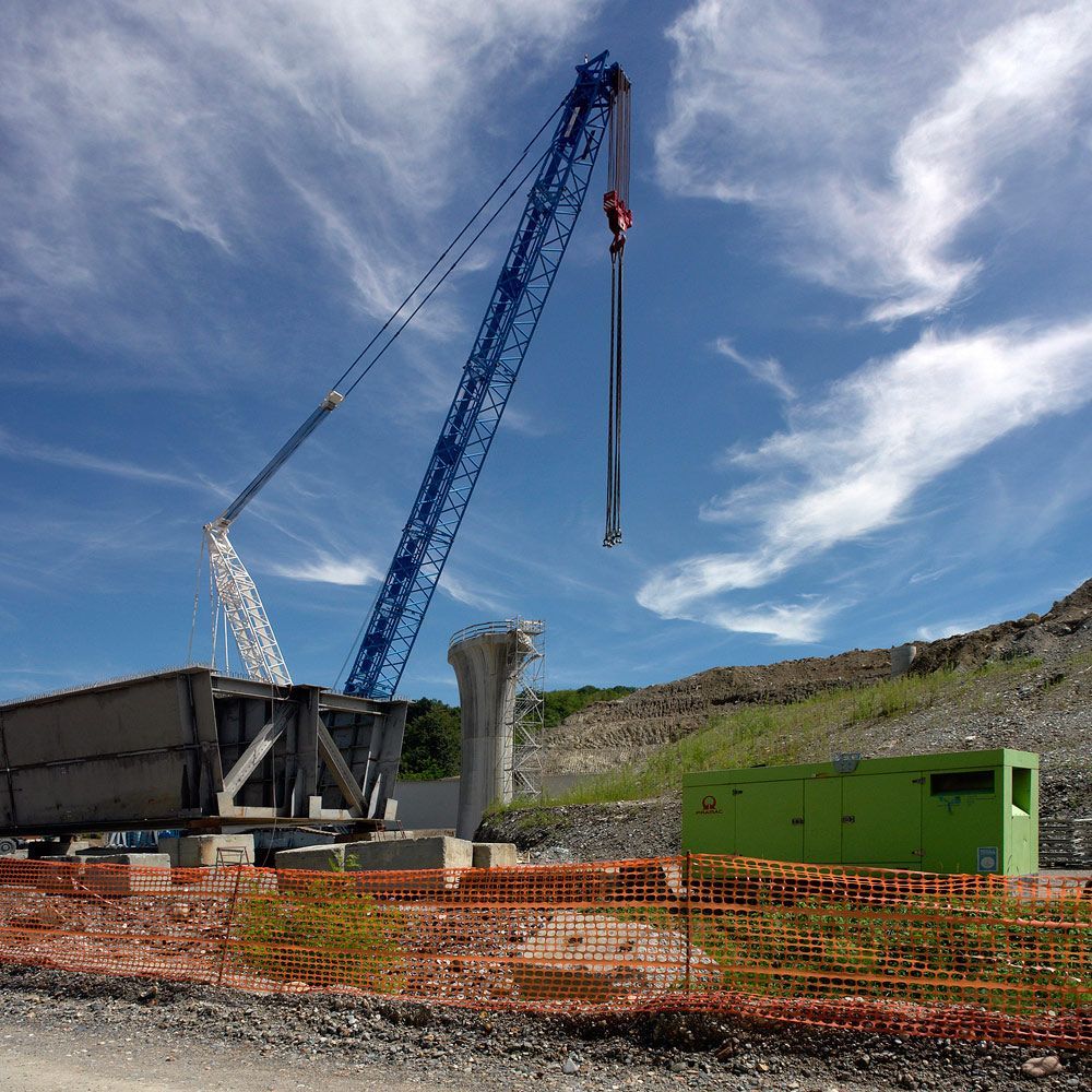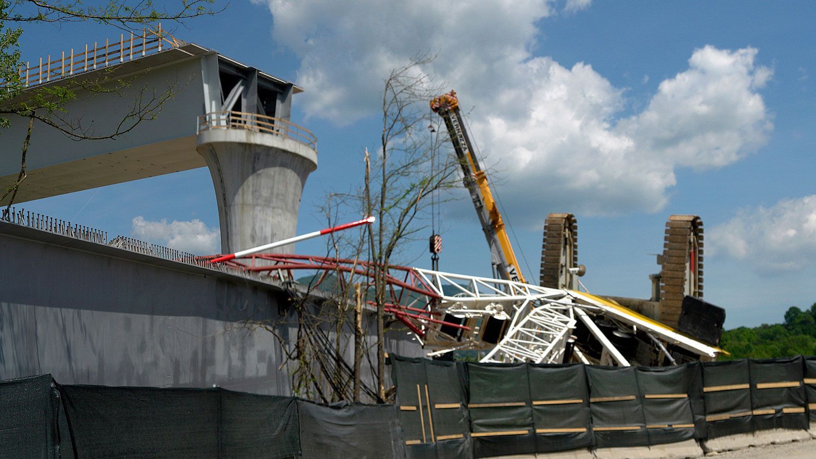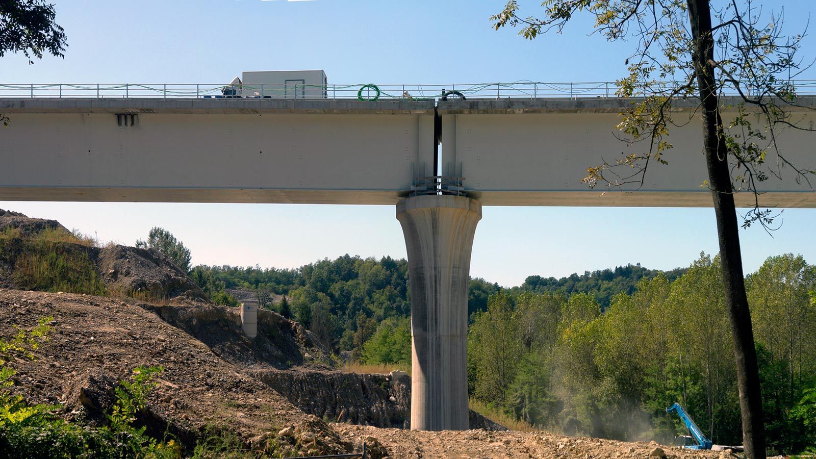 Der Blick von oberhalb der Beveratunnels auf die Bahnbrücke zeigt den Fortschritt der Bauarbeiten. Der umgefallene Kran ist weg. Zwei Brückenträger müssen noch hochgehoben werden. Der runtergefallene Brückenträger scheint wirklich nicht beschädigt zu sein und wird sicher noch diesen Monat hochgehoben. Ein fabrikneuer Kran ist geliefert, muss aber noch zusammengefügt und aufgestellt werden.