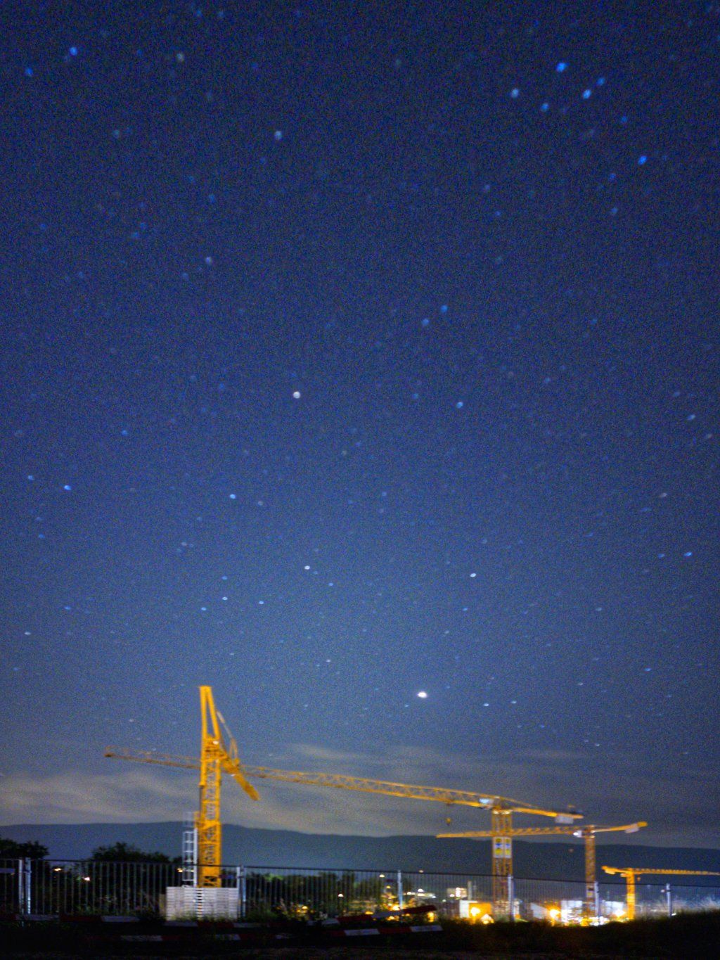 11.7.2023: Zufällig heute um 03h00 erwacht und auf die Dachterrasse gegangen um zu sehen, ob Jupiter und Mond bereits aufgegangen sind. Sie versteckten sich hinter einem Baukran, waren aber gut zu sehen. Wegen der Helligkeit des Mondes konnte ich diese Aufnahmen nur mit ISO 500 aufnehmen.
