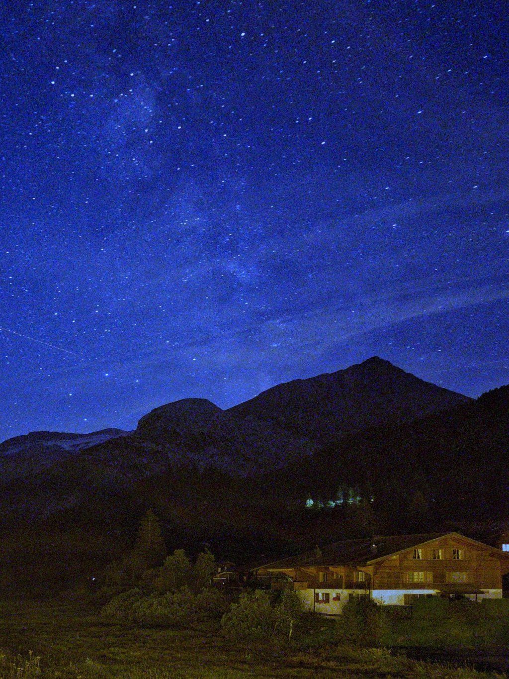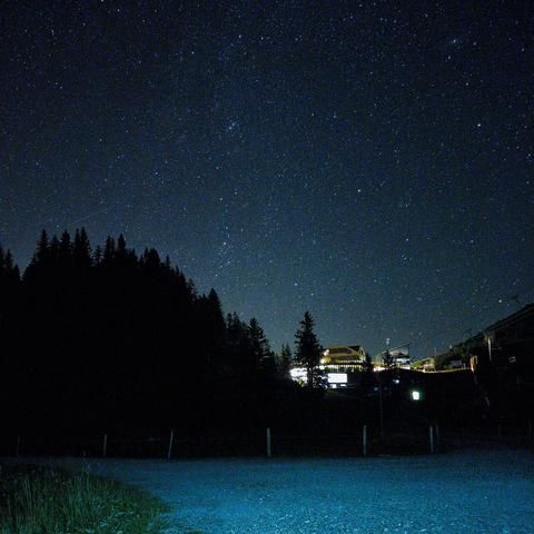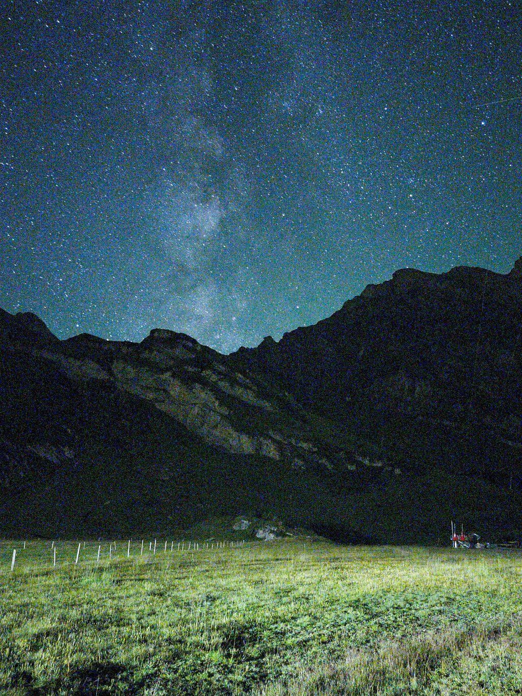 3.8.2022 - 01h25: Die Milchstrasse mit Flutlicht eines Kuhstalls hinter mir. Eine Handy Nachtaufnahme, mit Stativ, am Trüebsee (Zwischenstation der Titlisbahn), 1763m, OW / Schweiz