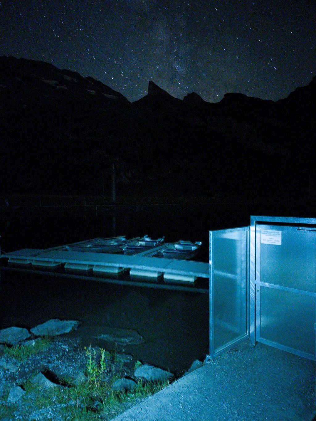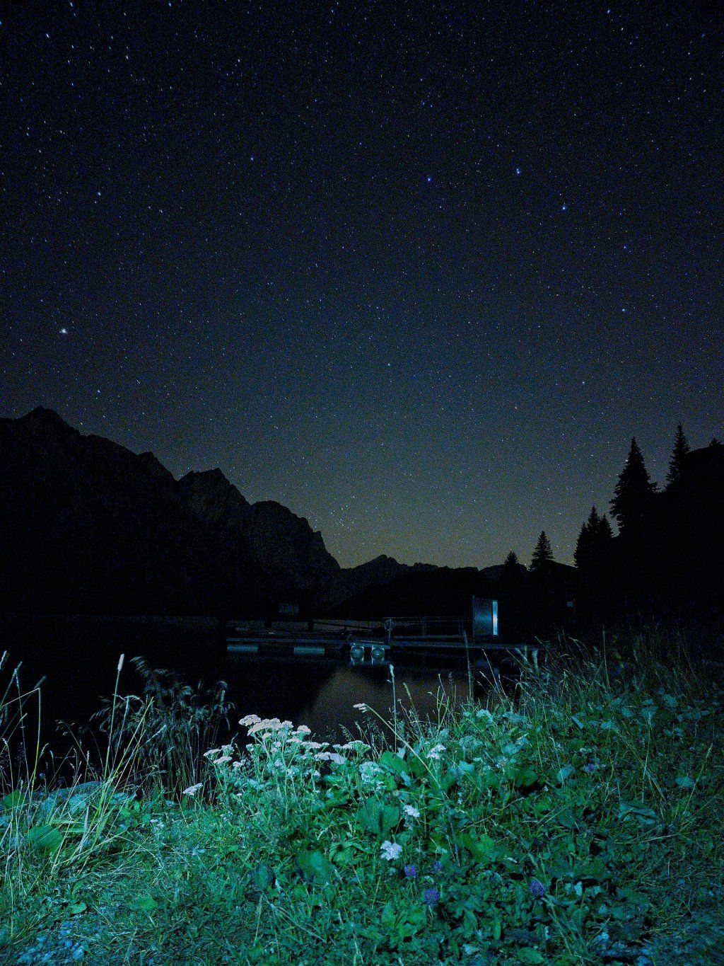 3.8.2022: Die Milchstrasse kurz vor Mitternacht. Eine Handy Nachtaufnahme, mit Stativ, am Seeufer des Trüebsee (Zwischenstation der Titlisbahn), 1763m, OW / Schweiz. Den Schiffssteg und das Gras am Seeufer habe ich mit meiner Taschenlampe angestrahlt.
