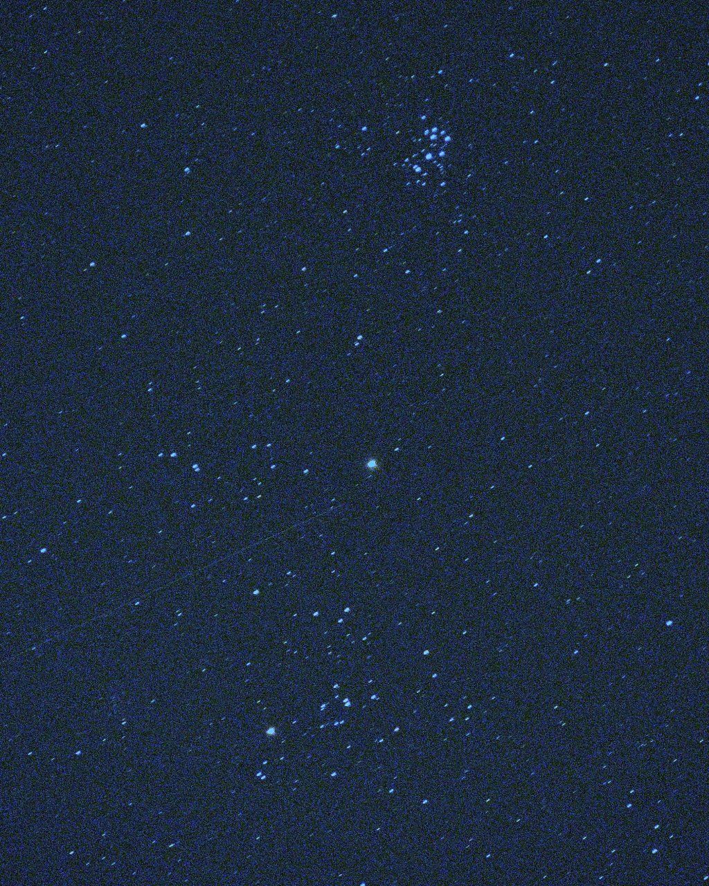 11.2.2023: Während meinen Beobachtungen der Plejaden rauschte von rechts her plötzlich ein Passagierflugzeug optisch direkt auf die Plejaden zu. Ich drückte im richtigen Moment ab und konnte die Positionslichter mit dem offenen Sternhaufen verewigen. Ein Glücksfall.