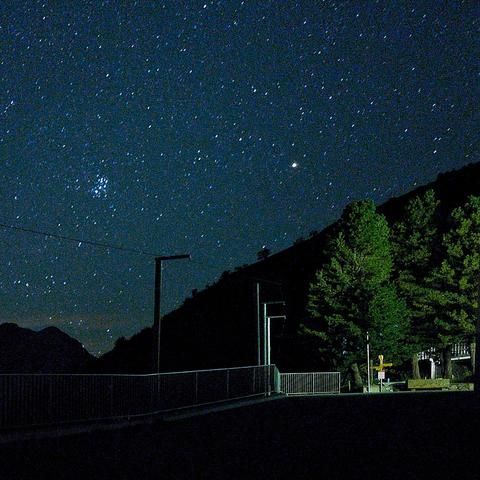 3.8.2022 - 02h33: Zurück beim Hotel Trüebsee gelang mir noch diese Handyfoto mit den Plejaden und dem Planeten Mars. Die Bäume wurden vom Hotel-Eingang angestraht. Die schönsten Astro-Landschaften sind diejenigen, wo der Vordergrung dezent angeleuchtet wird.