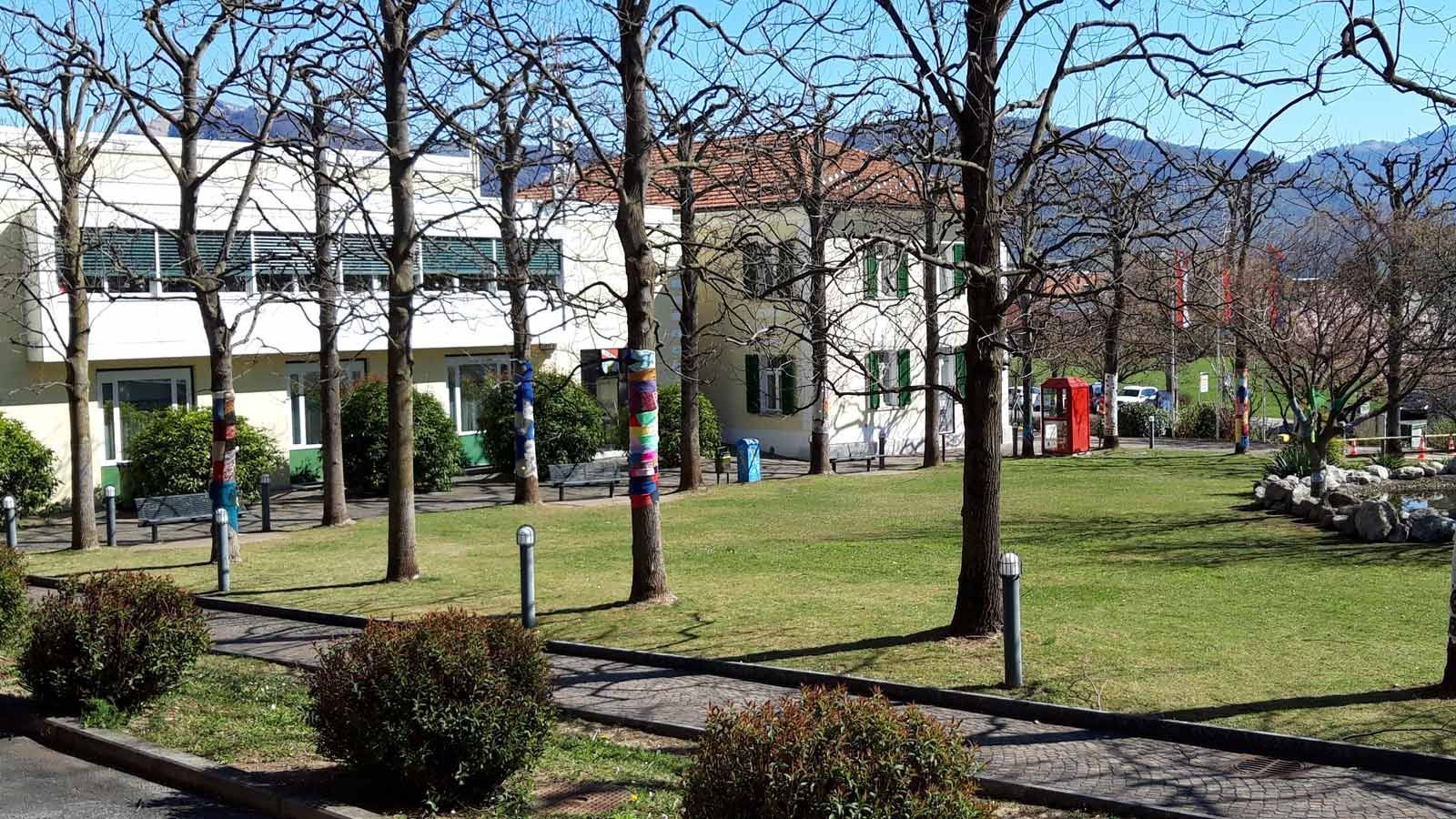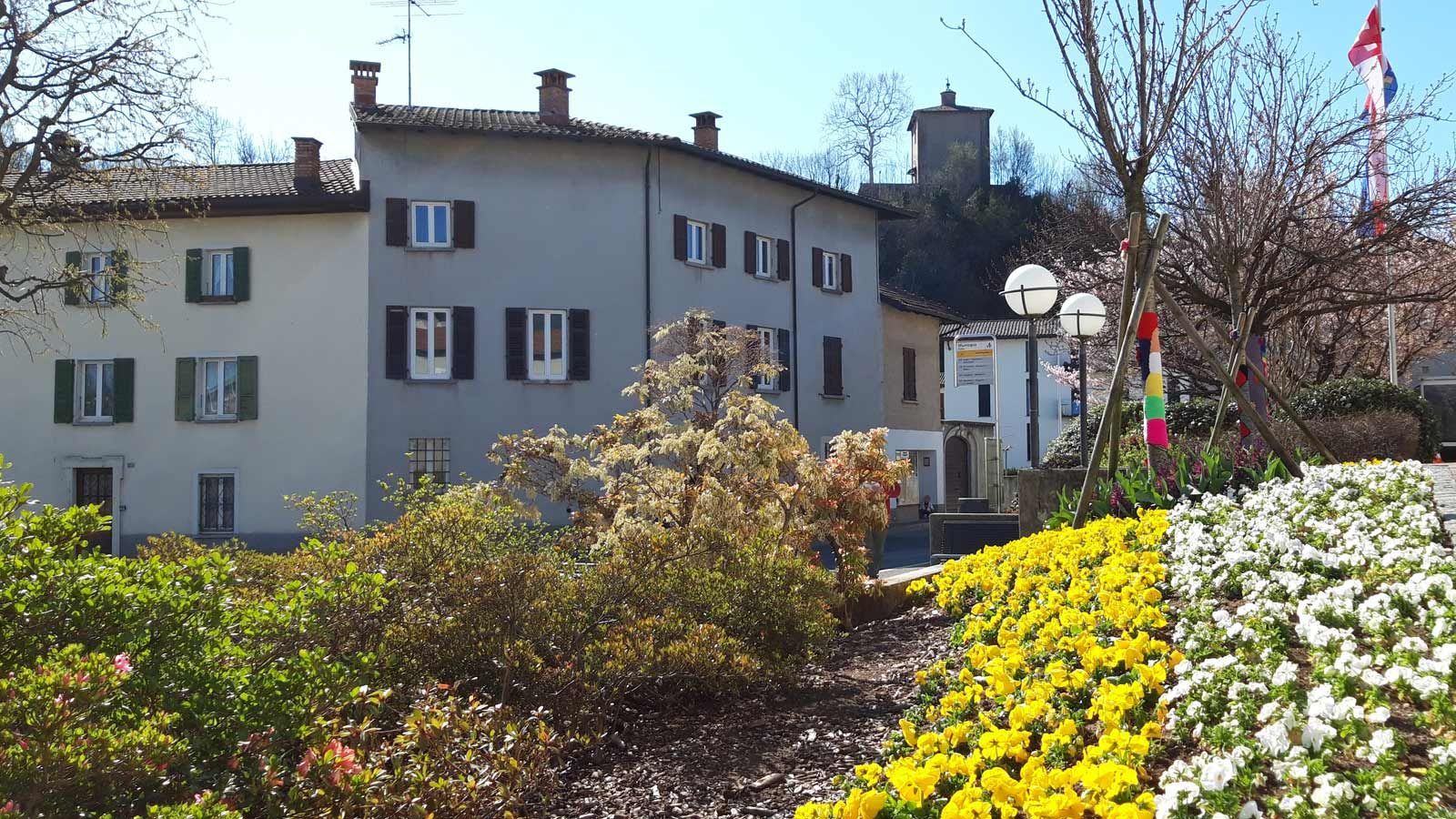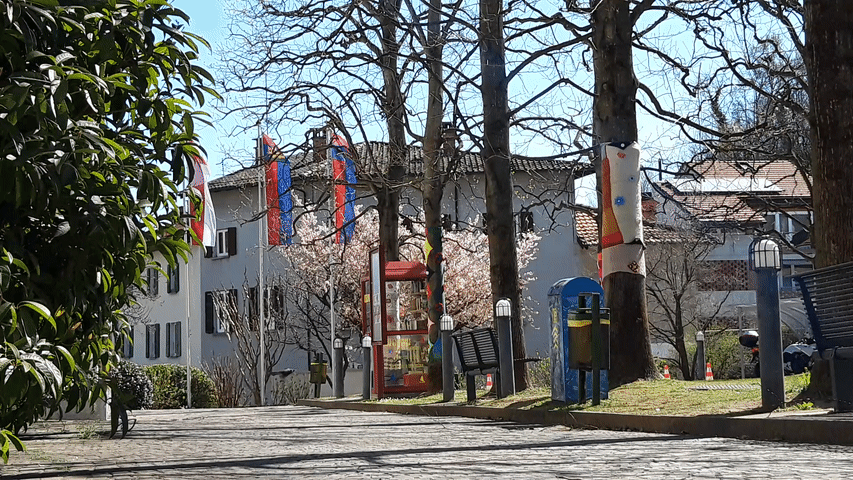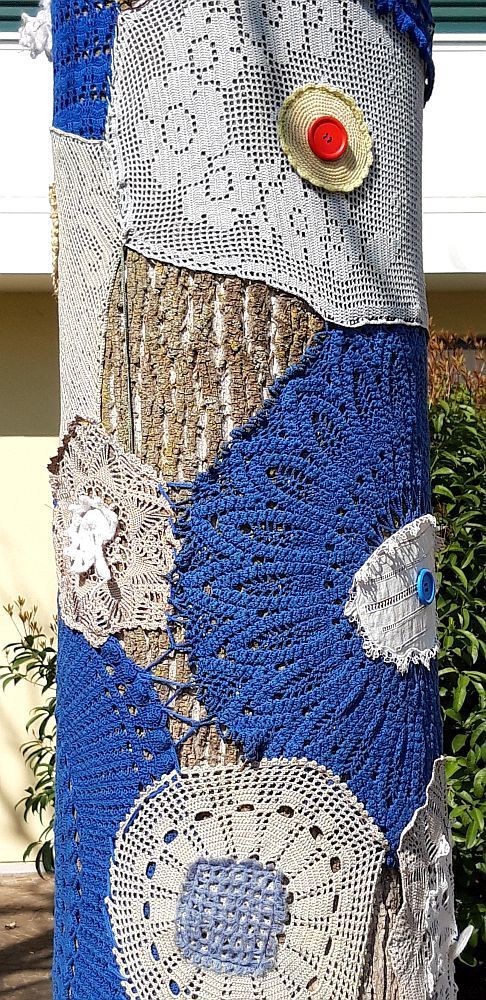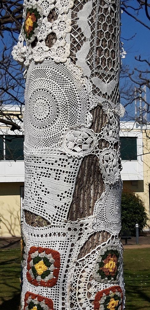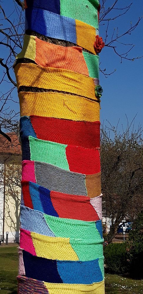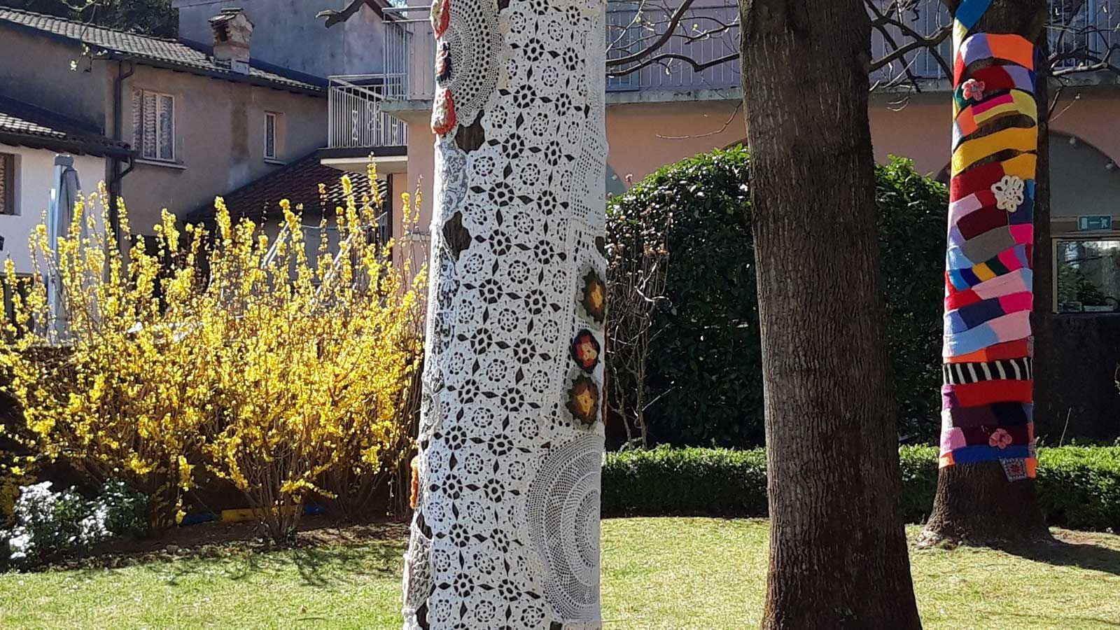 Ich beginne meinen Foto-Rundgang beim Gemeindehaus, welches von schönen Blumenbeeten umgeben ist, einige Bäume sind mit Wolle eingekleidet, im Rahmen der Wechselausstellung "Fare il filo" im örtlichen Museum.