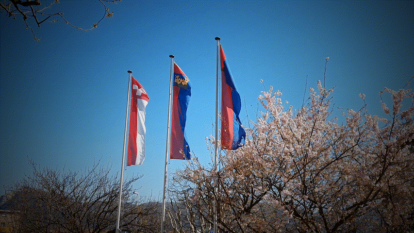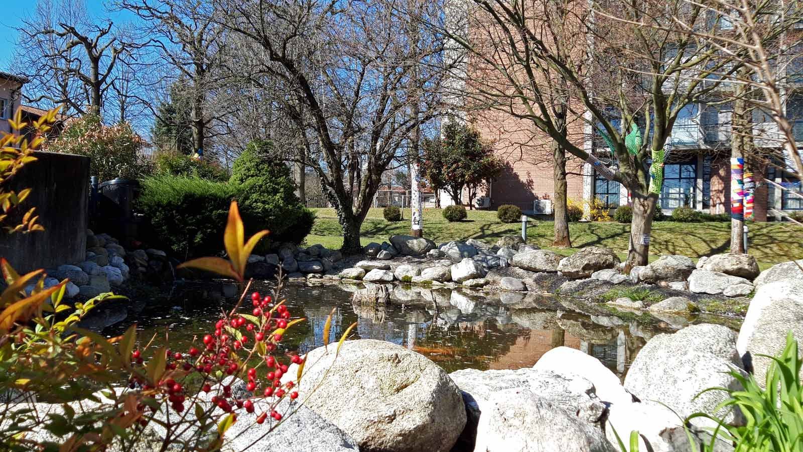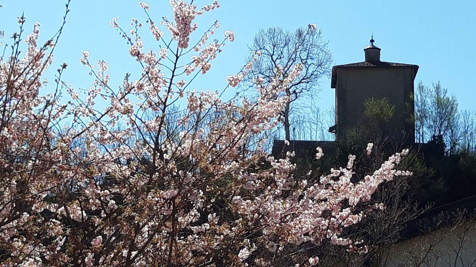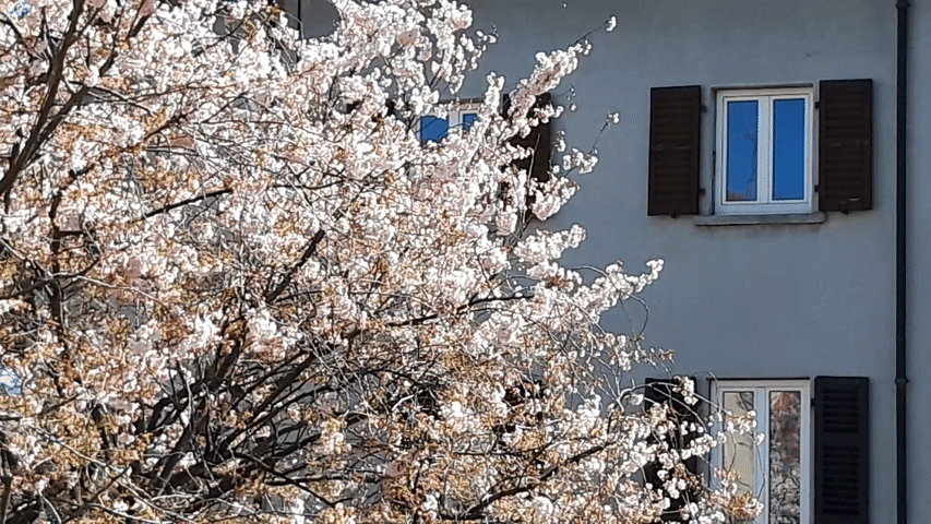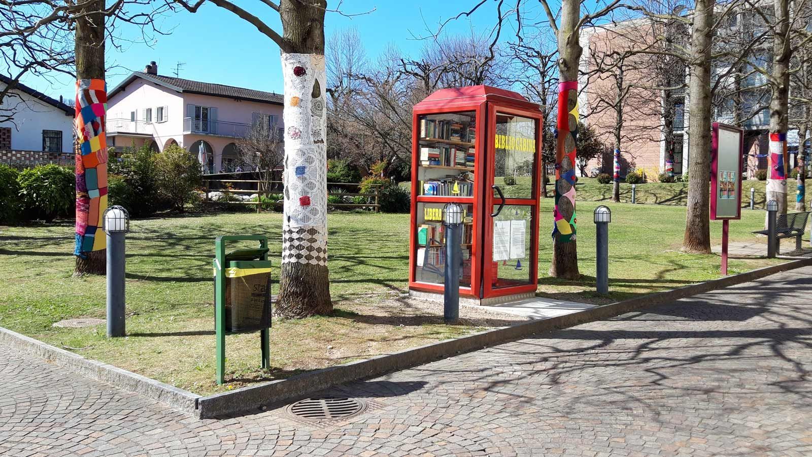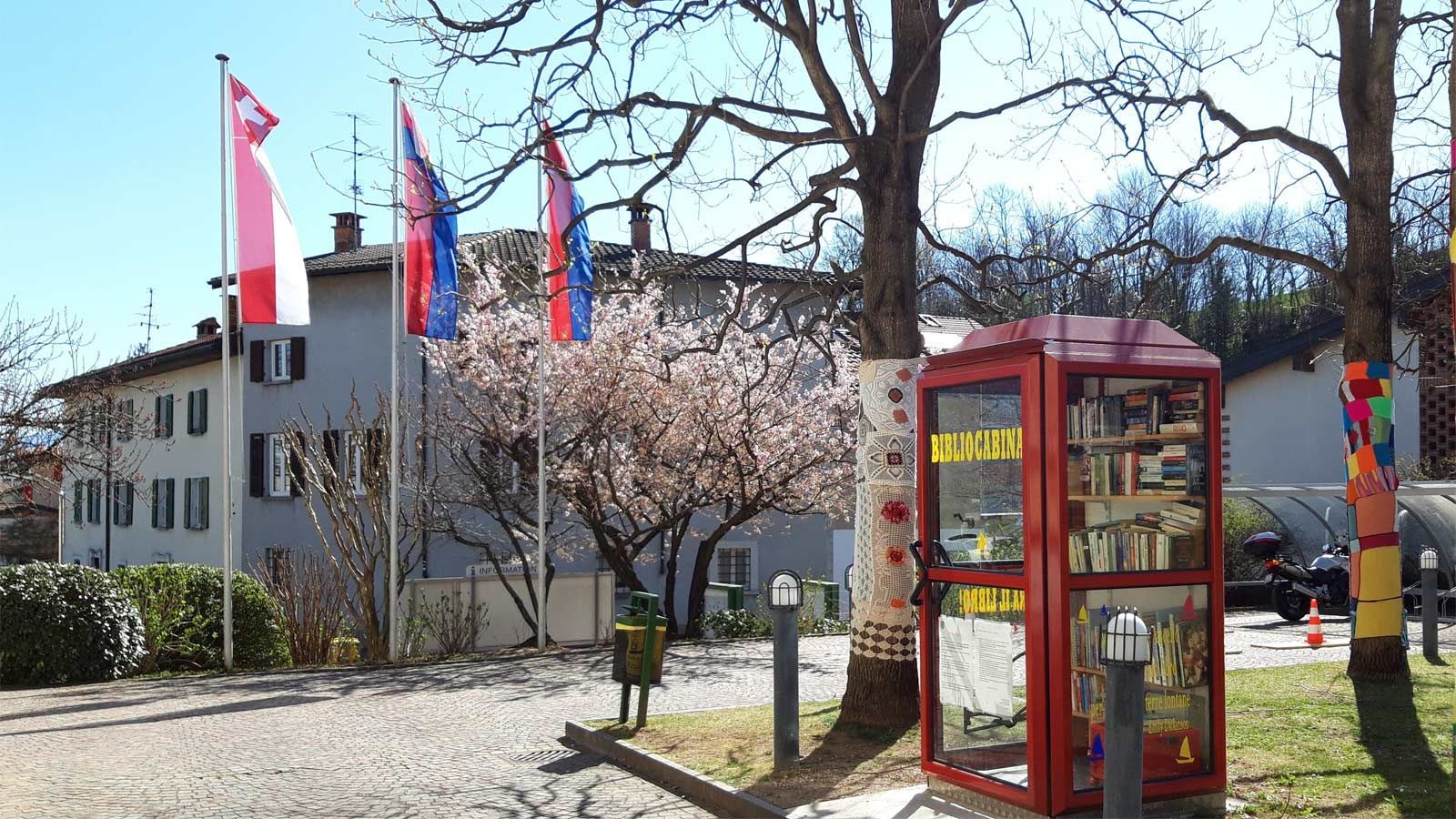 Ich beginne meinen Foto-Rundgang beim Gemeindehaus, welches von schönen Blumenbeeten umgeben ist, einige Bäume sind mit Wolle eingekleidet, im Rahmen der Wechselausstellung "Fare il filo" im örtlichen Museum.
