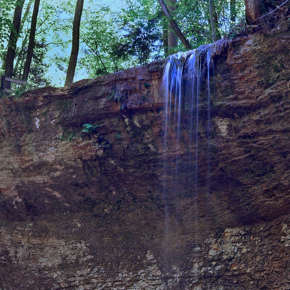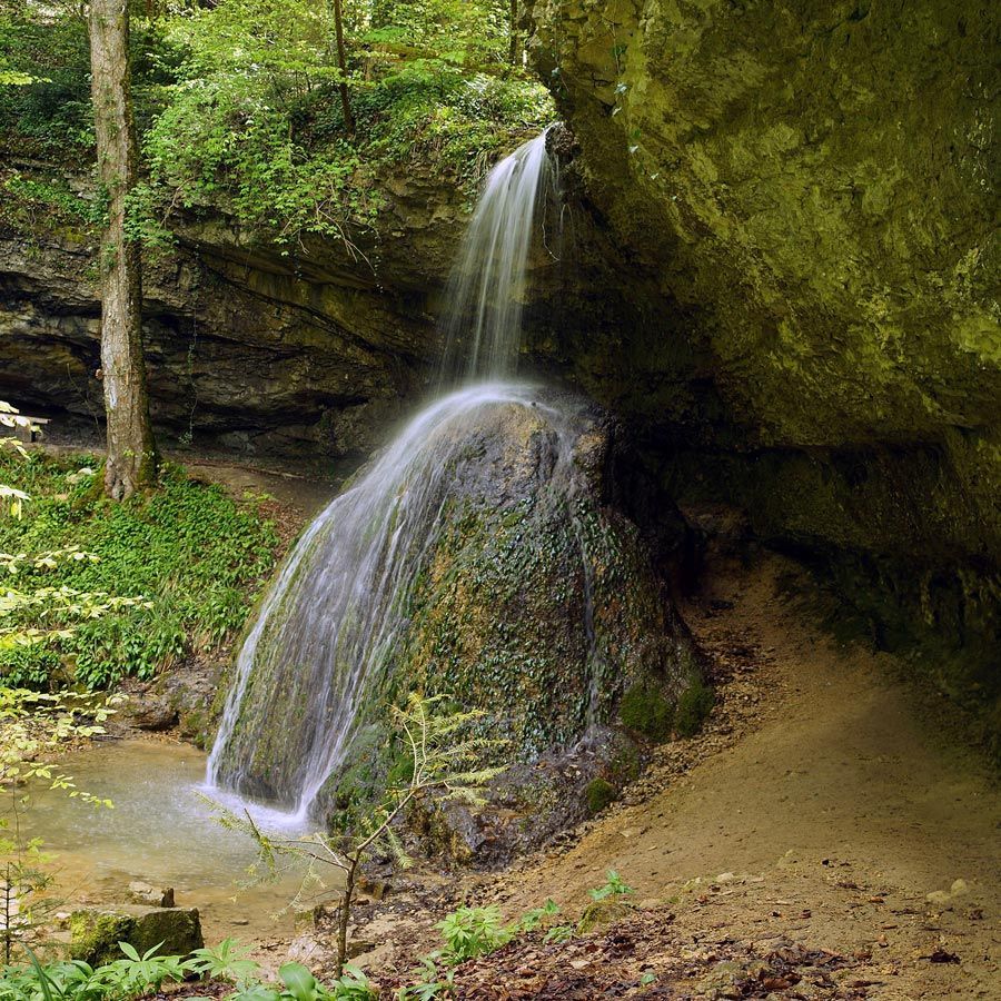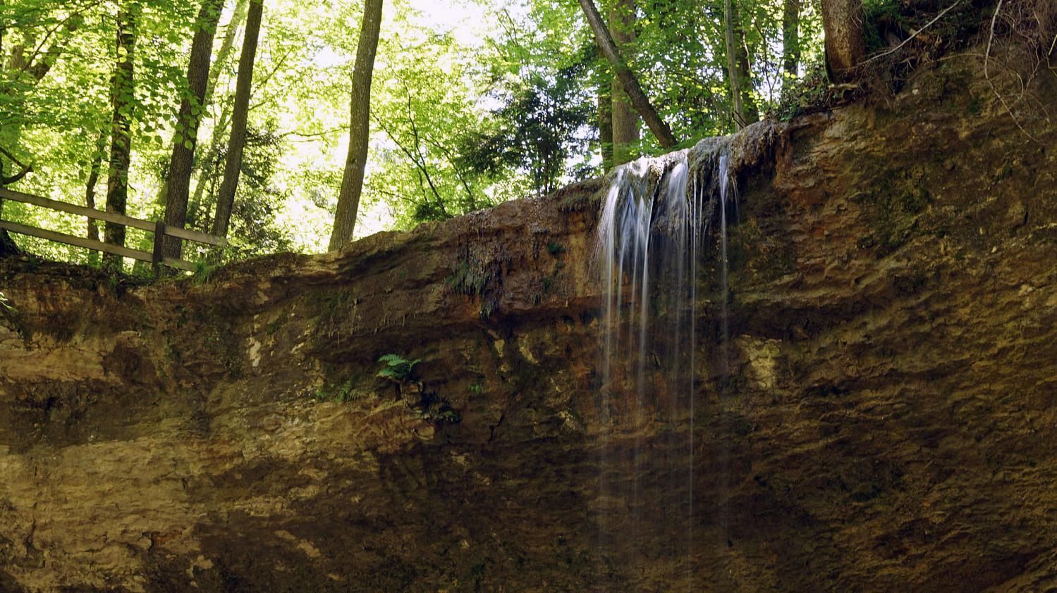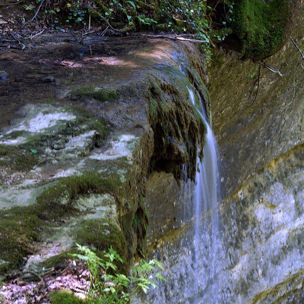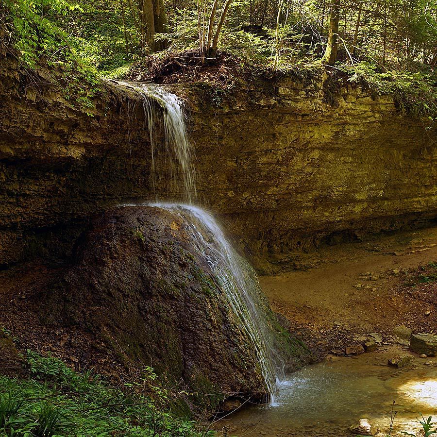 In der Tat lohnt sich dieser Ausflug. Der Fluebach fällt an dieser Stelle direkt unterhalb des Schlosses – etwas überraschend in dieser ansonsten eher sanft hügeligen Landschaft – über zwei recht steile, hohe Stufen zu Tal. Die obere Stufe fällt über ein unterspültes Felsband auf einen vorgelagerten Felsen und von dort in ein kleines Becken – eine sehr interessante Konstellation, die ich sonst noch nirgends im Jura gesehen habe.