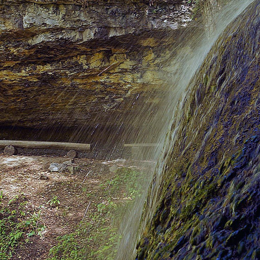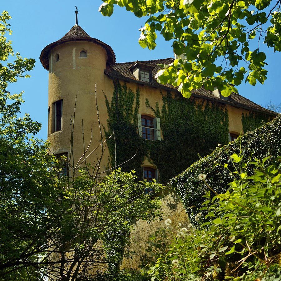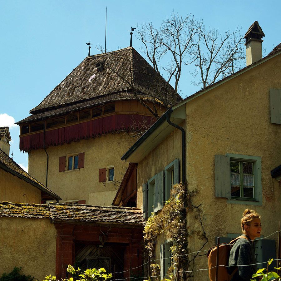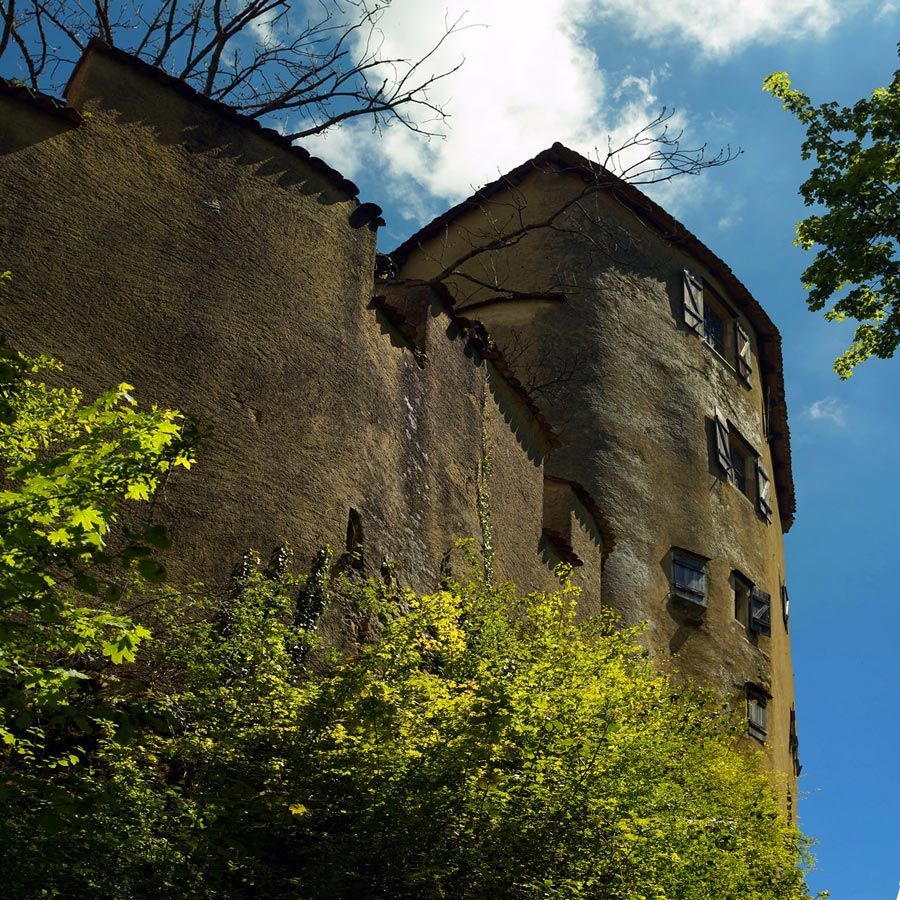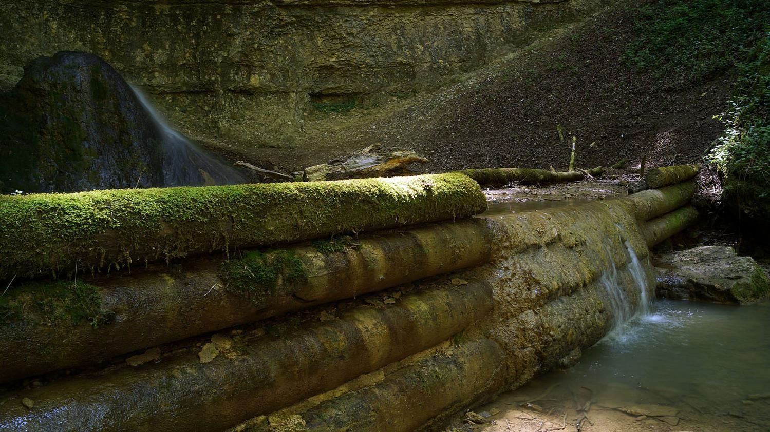 In der Tat lohnt sich dieser Ausflug. Der Fluebach fällt an dieser Stelle direkt unterhalb des Schlosses – etwas überraschend in dieser ansonsten eher sanft hügeligen Landschaft – über zwei recht steile, hohe Stufen zu Tal. Die obere Stufe fällt über ein unterspültes Felsband auf einen vorgelagerten Felsen und von dort in ein kleines Becken – eine sehr interessante Konstellation, die ich sonst noch nirgends im Jura gesehen habe.